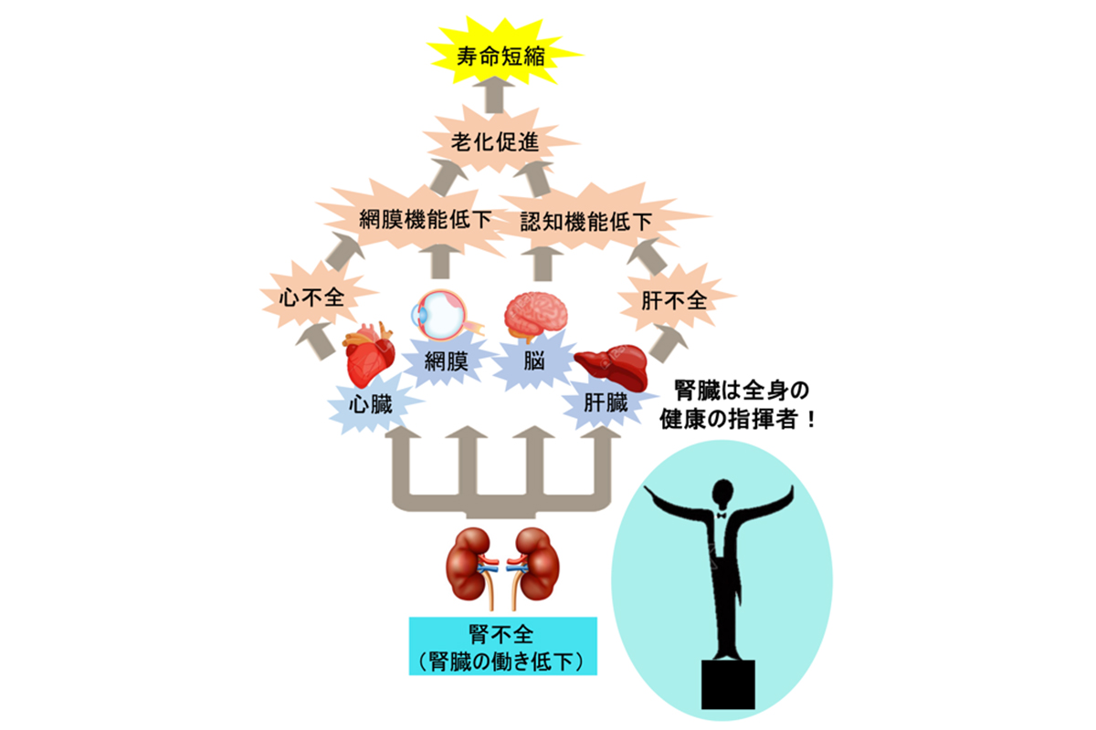 腎臓は老廃物の排出、血圧調節、水分と電解質バランス調整、造血、活性型ビタミンD生成などに関与し、体を正常な状態に保つために重要な臓器です。腎臓が慢性的に障害を受けることで慢性腎不全という病気となり、現在の医療では一度この病気を患うと回復することが出来ません。腎臓は扇の要のように生体の機能を支える重要な役割を果たす臓器で、腎機能低下により脳、網膜、心臓、肝臓など全身の臓器に影響が及びます。私たちの研究室では、慢性腎不全モデルラットを用いて、腎臓そのものだけでなく、肝臓、網膜や脳への影響を検討することで全身の健康維持効果を評価する研究をしています。