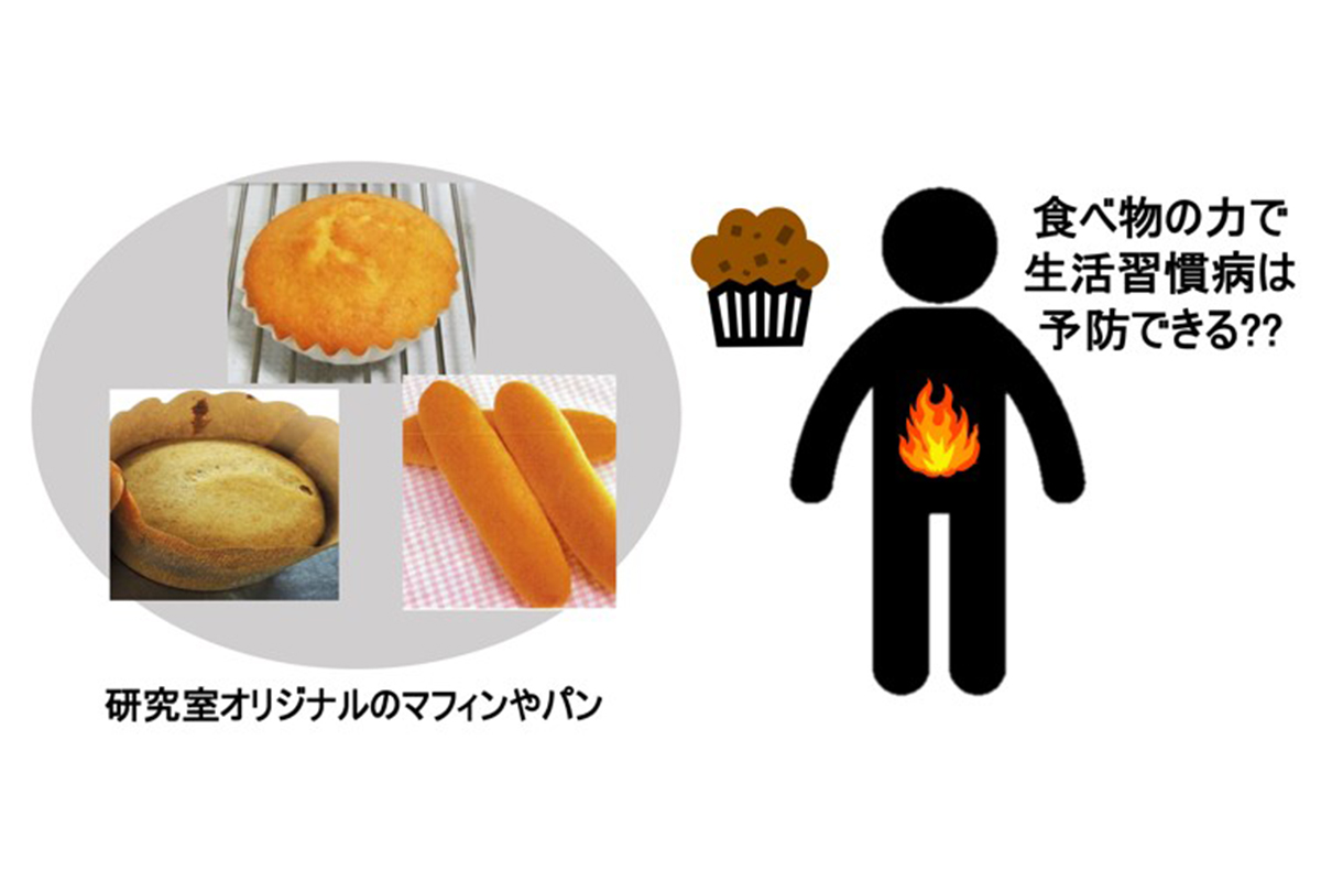 脂質には、温度によって固まりやすい脂質(飽和脂肪酸)と固まりにくい脂質(不飽和脂肪酸)が存在し、摂取する脂質の種類によって食後の生理作用が異なります。例えば、飽和脂肪酸を不飽和脂肪酸に置き換えるような食事をすることで肥満や糖尿病をはじめとした生活習慣病を予防できると報告する科学論文もあります。私たちの研究室では、様々な種類の脂肪を小麦粉に練りこんだマフィン(パン)を自作し、それらを摂取した被験者の血液や尿サンプルから「脂肪燃焼能力」や「糖代謝能力」を評価しています。私たちが毎日摂取する脂質の力で「肥満や糖尿病をはじめとした生活習慣病を予防できるか」、日々研究に取り組んでいます。
