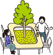 - 様々な居場所がゆるやかにつながるオープンな空間で、その時の目的・気分にあう場所を見つけて時間を過ごすことができます。