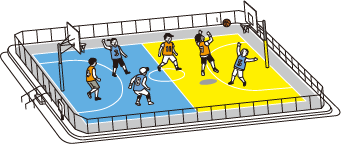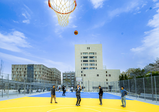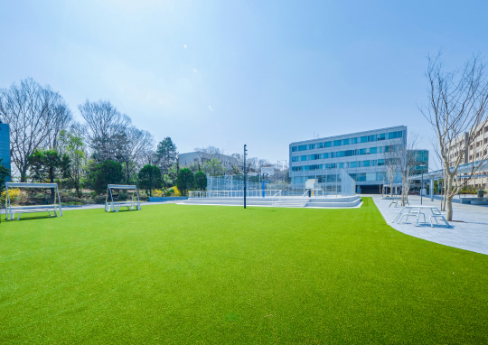 芝生やベンチのある庭は日常の居場所に、バスケットコートやステージはイベントの舞台に。HUBで芽生えた交流が、ここから学部棟へ、そしてキャンパス全体へと広がっていきます。