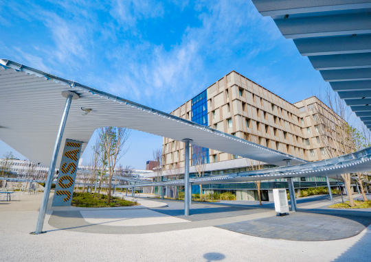 - 屋根付きの回廊でHUBと学部棟をつなぎ、雨の日も安心して移動可能