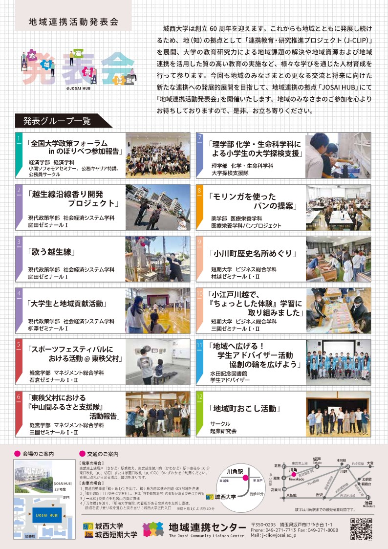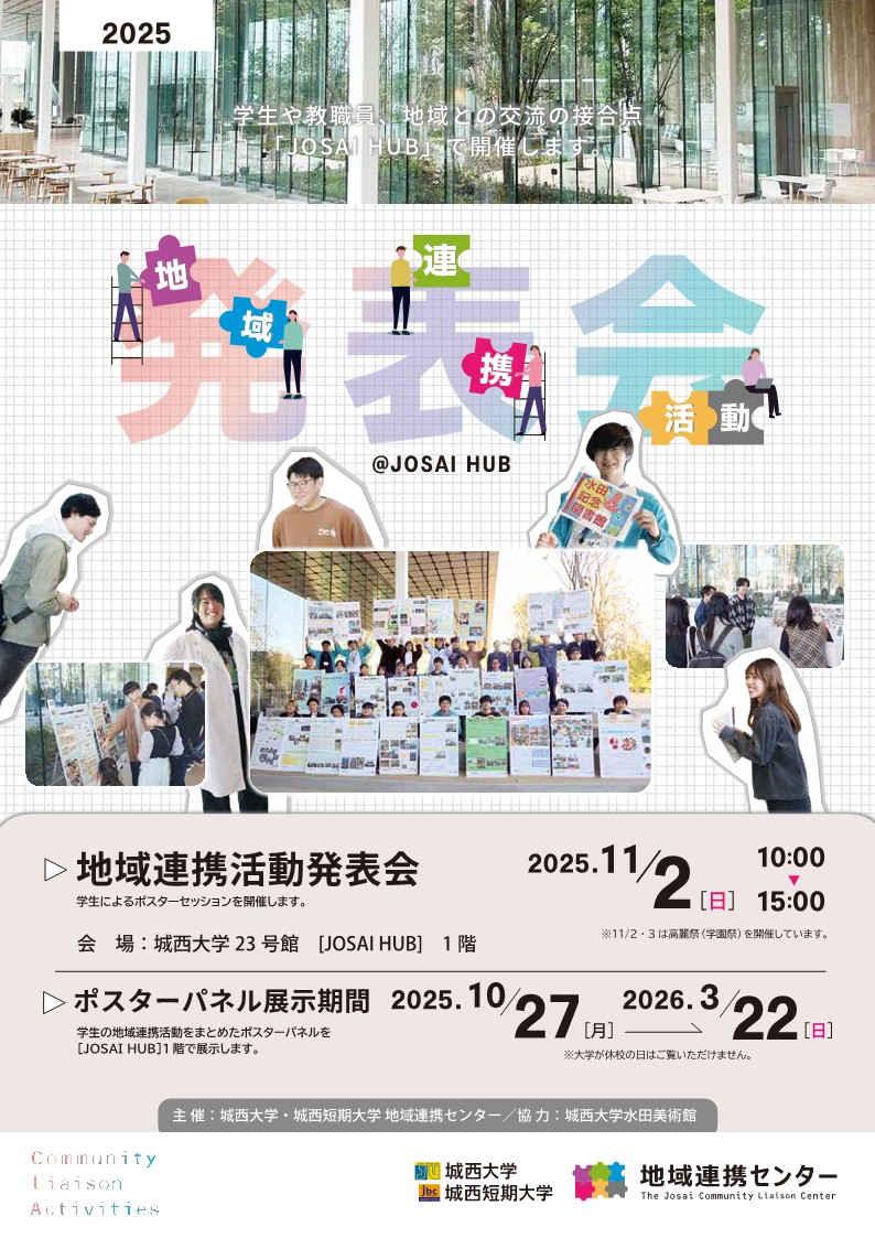 2025年度 11月2日(日)10:00~15:00 今年度も高麗祭開催に合わせ、11月2日(日)10:00~15:00に開催します。 さまざまな地域連携活動に取り組んだ学生が自分たちの活動内容を紹介します! 皆様のご来場をお待ちしております。