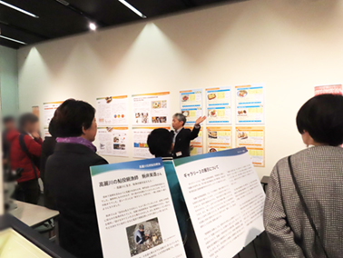 ギャラリー2では、高麗川伝統鮎漁について、環境と教育について、近隣レストランシェフによる鮎料理、医療栄養学科からの視点で栄養面について解説。顕微鏡でマウスの肝臓の細胞を観察し、魚食の重要性についてお話いただきました。