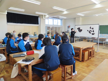 出張プログラムでは、昨年度1月に行ったコレクションアートゲームと同様、1年生から3年生までの美術の授業における美術館体験学習を実施しました。今回は、水田美術館が浮世絵所蔵館であることから、浮世絵が誕生する江戸時代の文化に親しむため、当時流行したパズルゲームをグループワークで行いました。正方形、台形、平行四辺形、三角形の様々な形をした7つのパズルピース全てを組み合わせて、問題に出された形を完成させるというゲームになっていて、グループ内でコミュニケーションを交わしながら形を完成させていきました。スマートフォン、パソコンなどのデジタル機器は用いず、自分たちの頭脳やひらめきだけを頼りにするため、初めは苦労しながら臨んでいた生徒たちでしたが、形ができたときの達成感や喜びを感じると、だんだんと楽しめるようになっていきました。