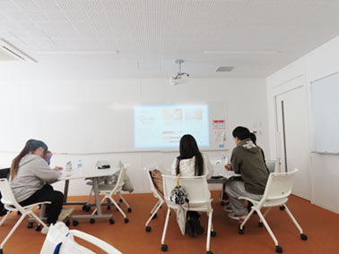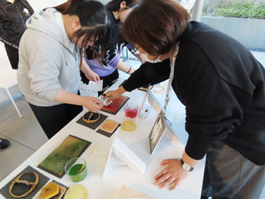 第1回目では、学内施設学習ということで美術館ガイダンスと展示見学を行い、開催中の展覧会(「高麗川物語-環境と食と健康-」)を鑑賞、第2回目では当館が所蔵するコレクションを通して浮世絵の歴史を概観しながら、その魅力や西洋絵画との表現の違いなどをご紹介、第3回目では前半に復刻版を用いた鑑賞ワークショップ、彫と摺の木版画技術をスライドとDVDで紹介したのち、後半に摺り体験コーナーで摺りの工程を実際に体験しました。