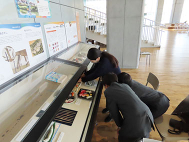 水田美術館では、1日目(26日)、はじめ美術館についての説明を学芸員から聞いたのち、簡単なコレクションアートカードゲームを通して所蔵品に親しみました。その後、図書館の職場体験をしている生徒とともに、大学美術館の特徴でもある授業支援の一端を知るため、大学生の授業をのぞいてみたり、学内を回りながらそのほかの施設や大学職員が様々に働く現場を訪問しました。