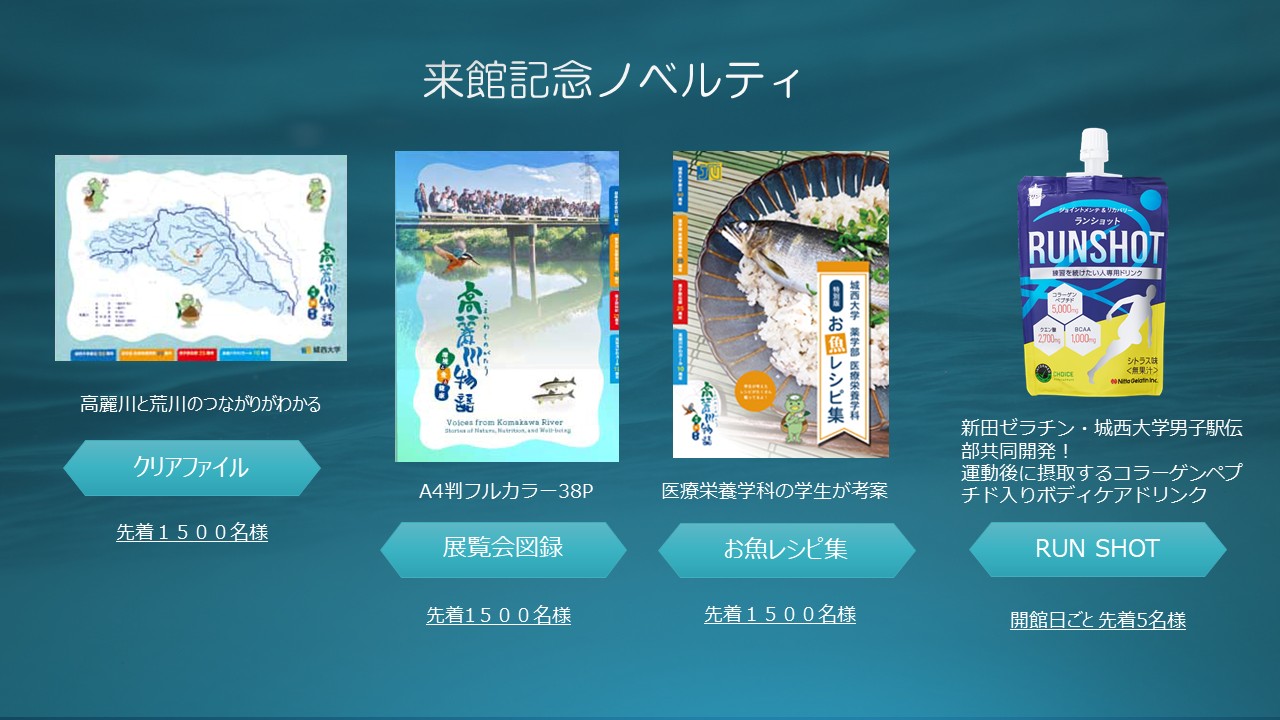 最後に、本展は、城西大学創立60周年、医療栄養学科 25周年、男子駅伝部 25周年、そして「高麗川かわガール」 10周年を記念して企画されたものです。