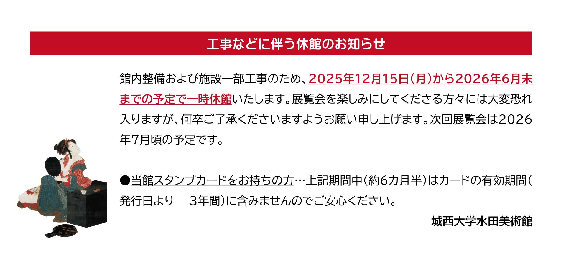 工事などによる一時休館につきまして【2025年12月15日(月)~2026年6月末頃まで】