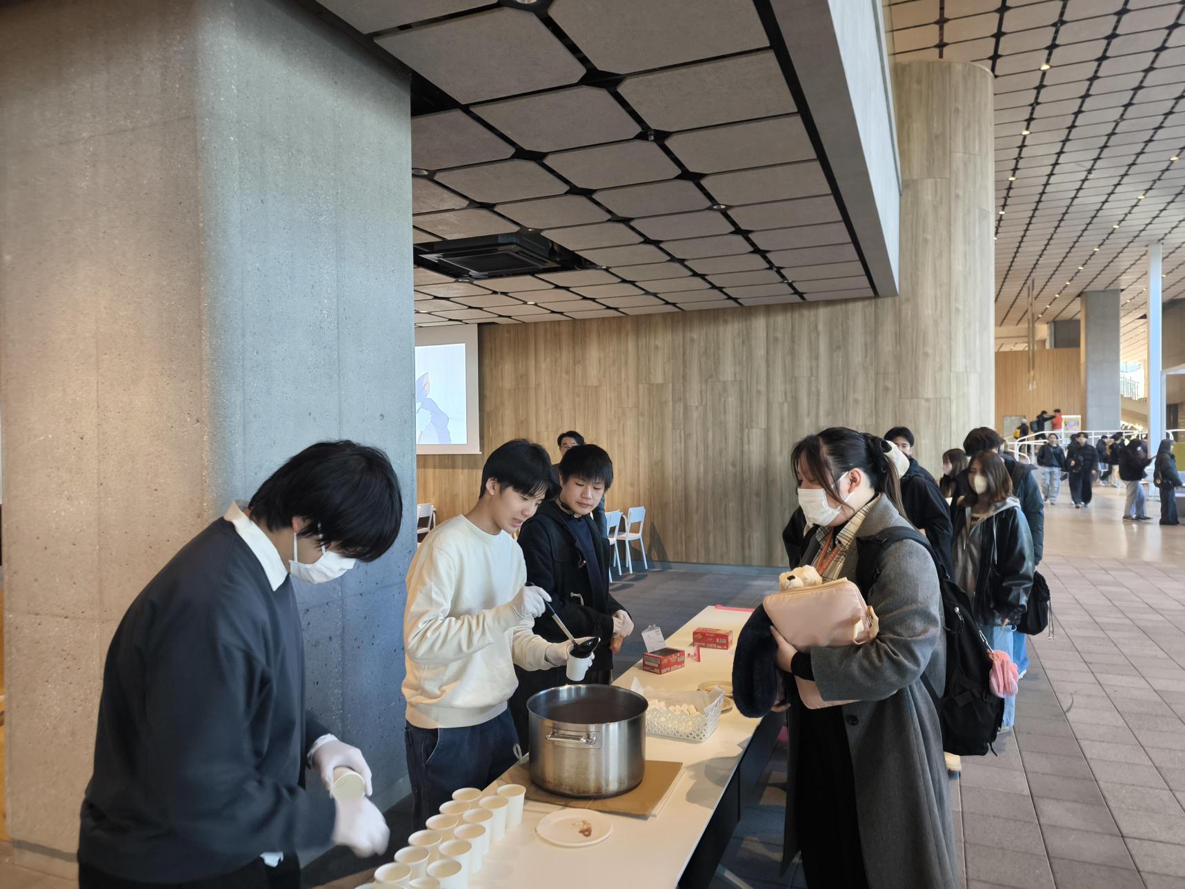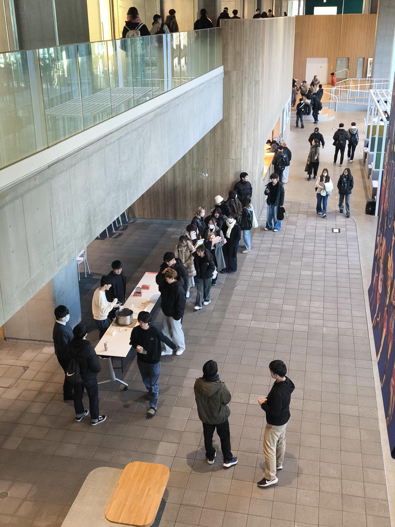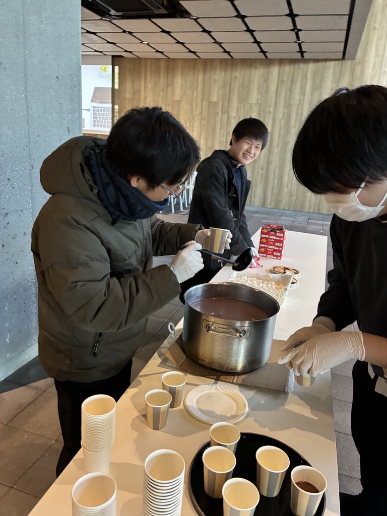 「授業以外で学生同士が自然に話せる機会をつくりたかった」と企画した学生は話します。初めて参加する学生も多く、はじめは緊張した様子も見られましたが、ココアの温かさに包まれながら、次第に会話が弾み、学年や学部を越えた交流が生まれていきました。