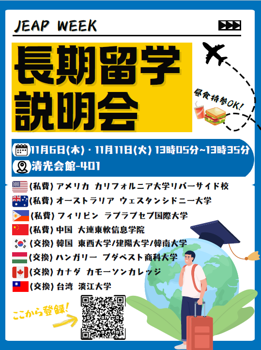 今回は、長期留学についての説明を行うとともに、先日留学を終えて帰国したばかりの先輩から、留学の魅力やとっておきの体験談をお話ししていただきます。