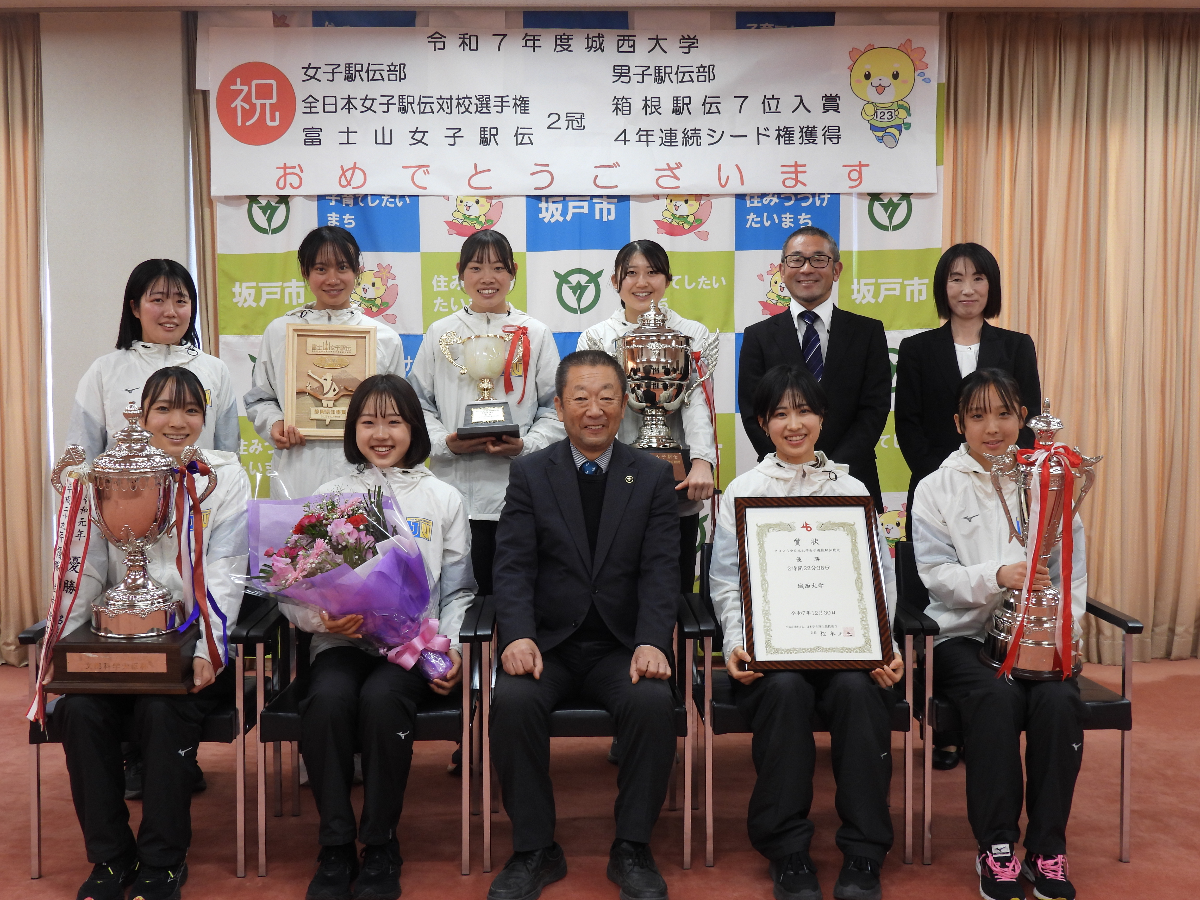 2025年1月27日、城西大学男子駅伝部および女子駅伝部が、駅伝シーズンでの活躍を報告するため坂戸市役所を訪問しました。