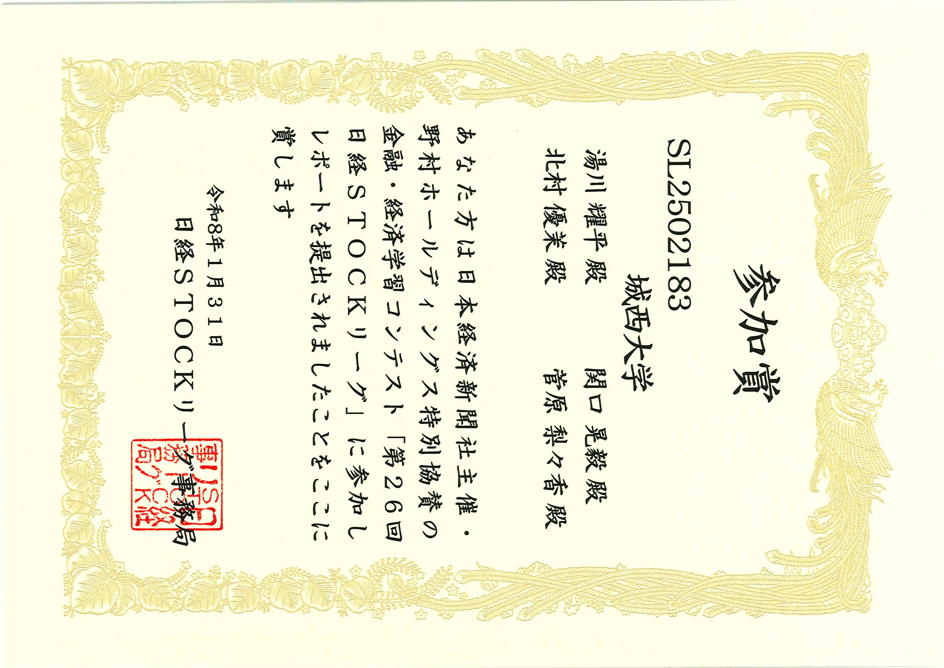 城西大学起業研究会(顧問:経営学部 杉本 理教授)の湯川耀平さん、北村優栞さん、関口晃毅さん、菅原梨々香さんの4名が、日本経済新聞社が主催する金融・経済学習プログラム「第26回日経STOCKリーグ」に参加し、見事レポートを書き上げ、参加賞を頂きました。