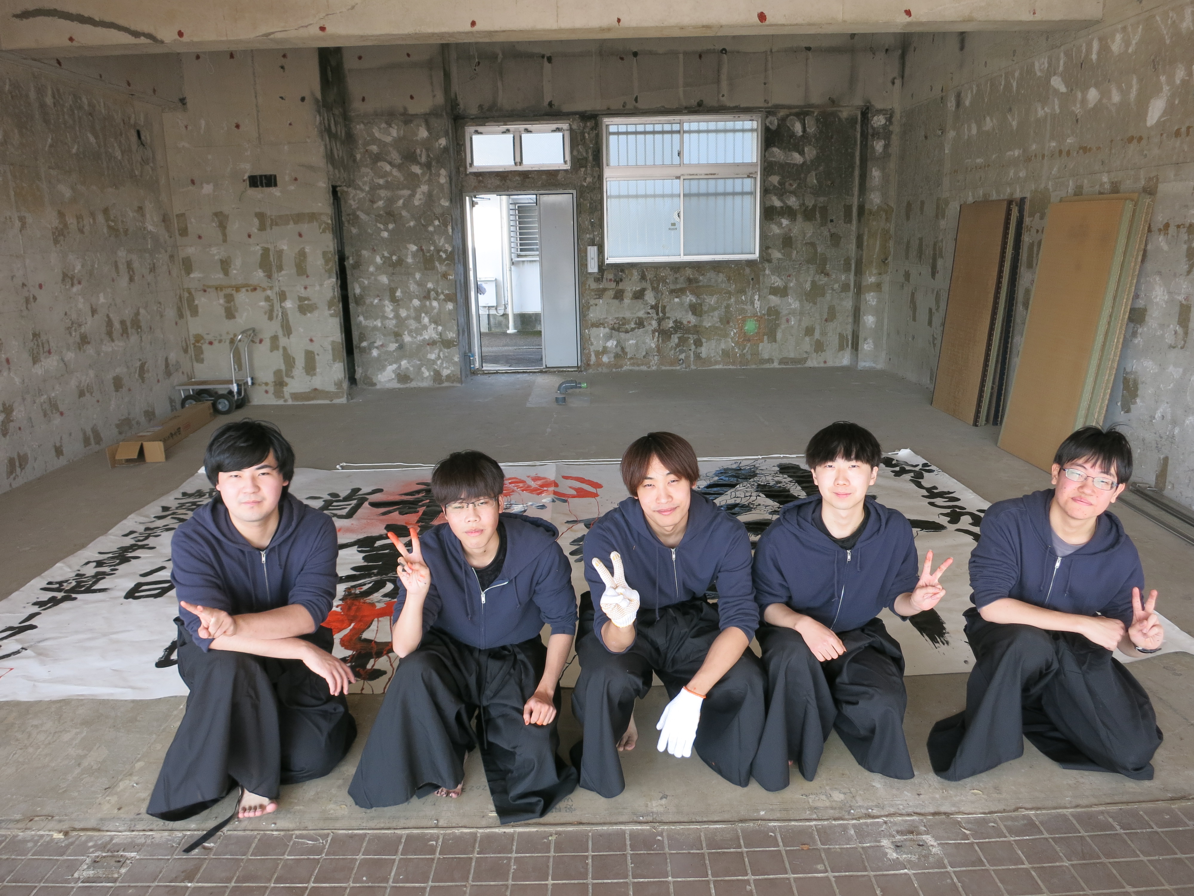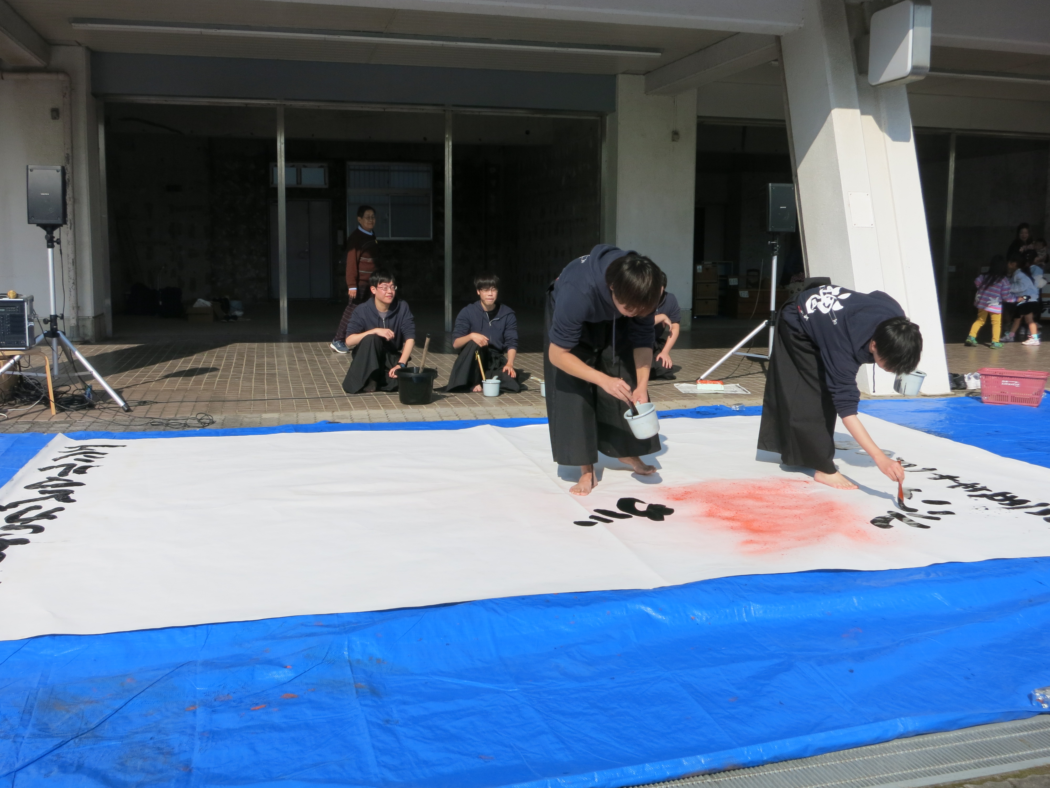 書道サークルが会場の中央広場で、書道パフォーマンスを披露しました。夏から準備を始め、毎週のように練習を重ね、当日を迎えました。リズミカルな曲にあわせ、5名の学生が順番に5m×3mの和紙に書を連なっていき、会場を盛り上げました。『絆で結ばれた心がある限り希望の光は消えはしない』の書が青空の下に立て掛けられ、観客から大きな拍手が沸き起こりました。