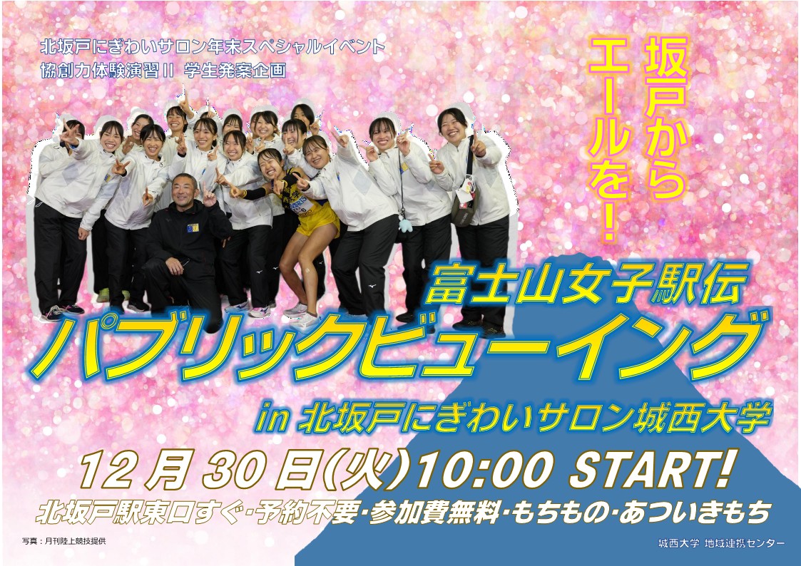 地域連携センターでは、数多くの提案の中から、“すぐに実現できるもの”として、 『富士山女子駅伝パブリックビューイングin北坂戸にぎわいサロン』を、2025年12月30日(火)に開催しました。