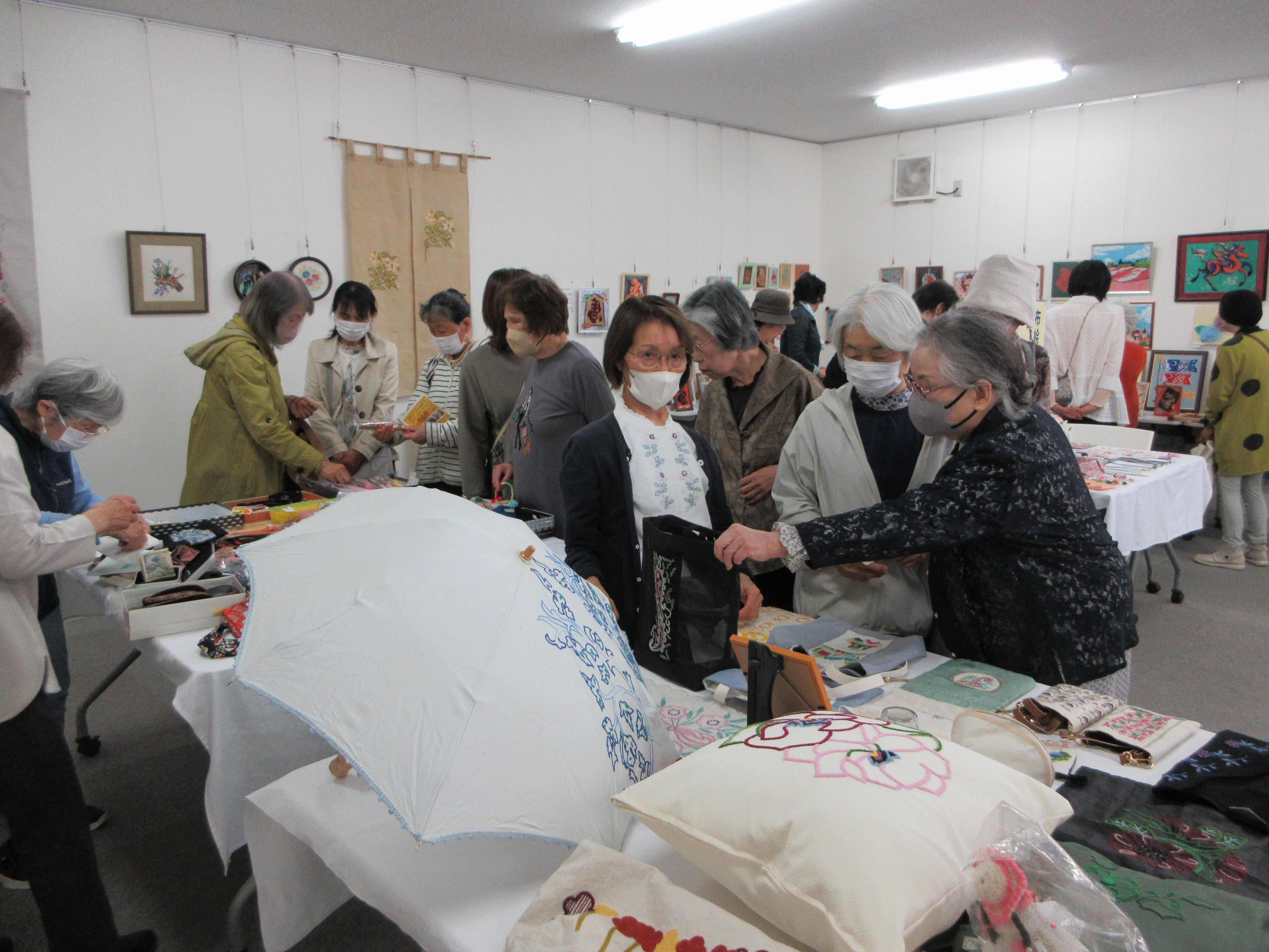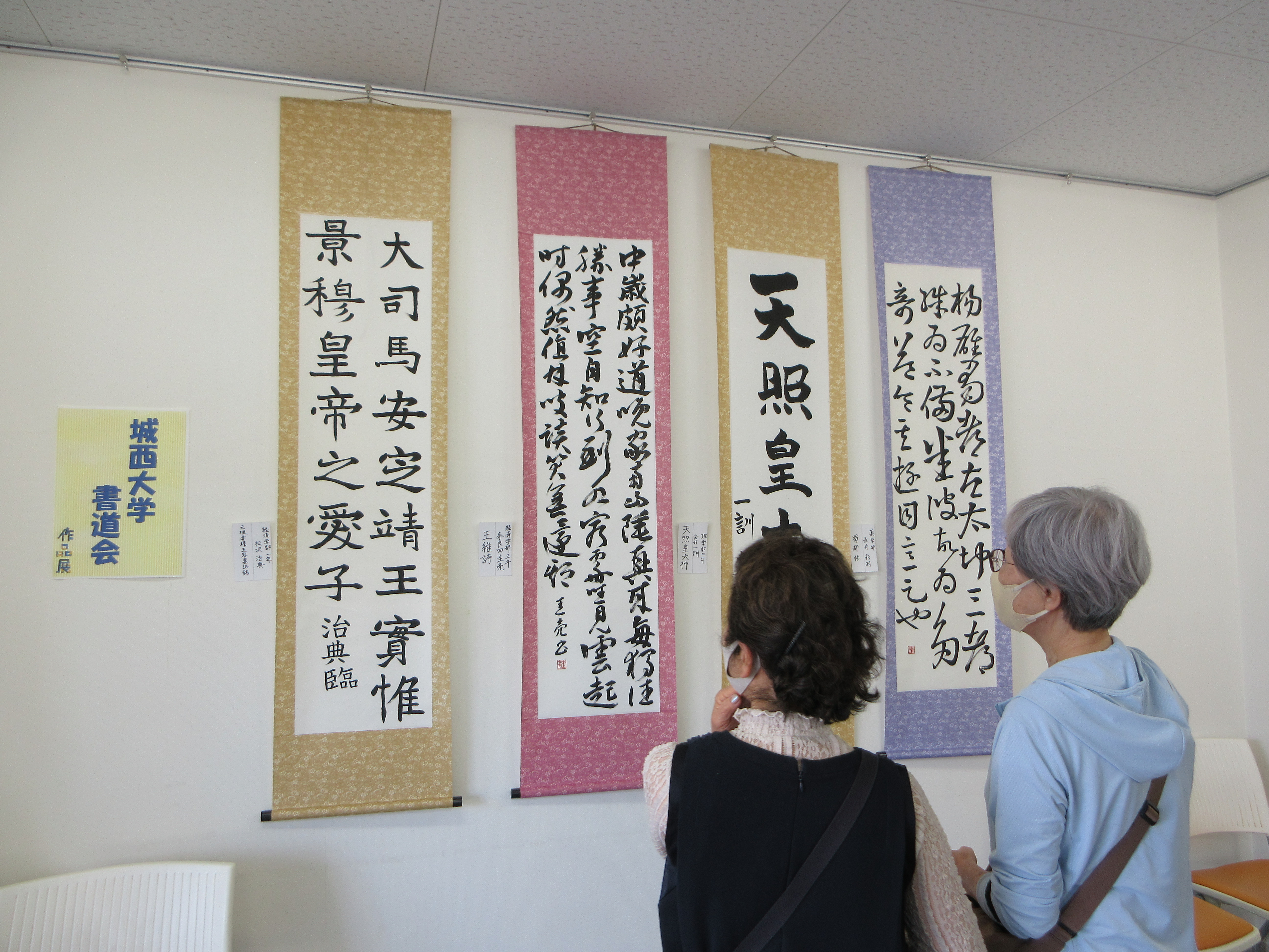 サロンの活動グループからは、「なかよし会(手芸全般)」、「ちぎり絵の会」、「ししゅうクラブ」、「布絵サークル」、「ひだまりクラブ(手芸全般)」、「パッチワーククラブ」の6団体が参加し、城西大学からは「書道会」が特別参加しました。