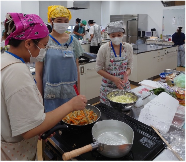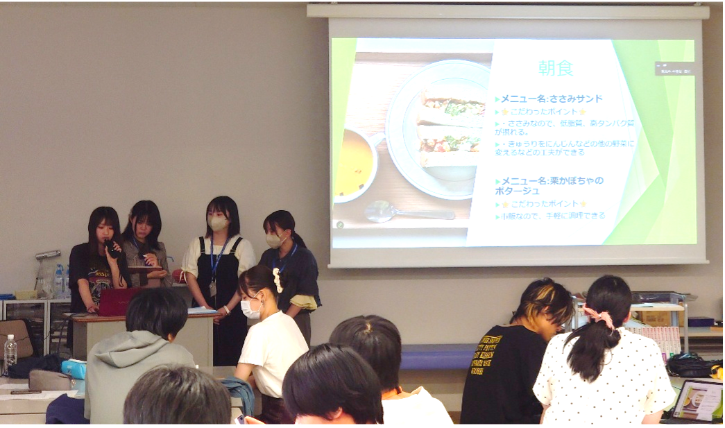 各学科1~3年生混合でのグループに、薬学科の4年生が2~3名ずつ入り、顔合わせ、自己紹介を行い、各学科の特色を生かしながら、症例について話し合っていき、症例の患者さんに合わせたメニューを考案してきました。学生達は、だんだんと打ち解けて、積極的に意見交換していました。9月、がん患者さんのためのメニュー考案に向けて話し合い、各グループで提案されたメニューで試作し、改善点も盛り込んで、再度試作し、意見交換・改善をして、献立、メニューブックが完成しました。3学科でそれぞれの特色を生かしながら、患者さんとご家族を思ってメニューを考案し、自ら試作をした経験は、薬学科の学生達にとっては初めてのことでしした。この経験を今後の学外実習、将来は薬剤師として、患者さんやご家族に寄り添って、治療薬をはじめ、食事面へのサポートに生かしていくことができるよう期待しています!