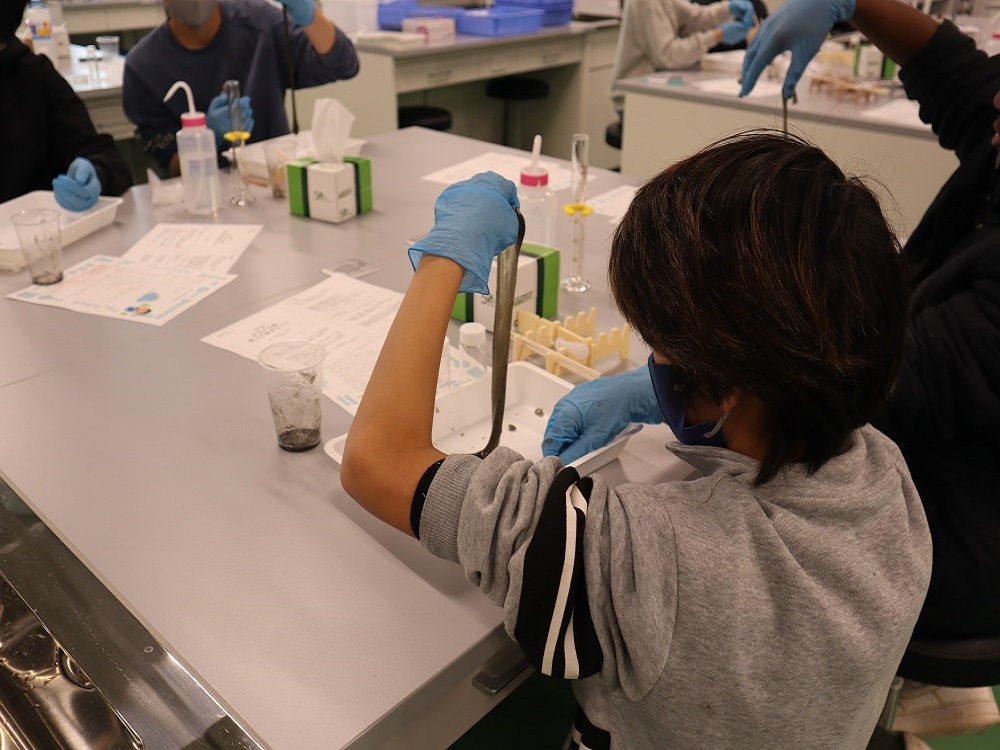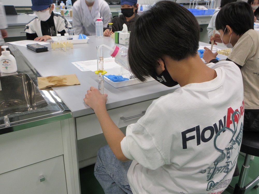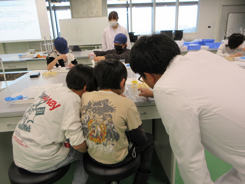 いざ実験が始まると、小学生の皆さんは慣れない道具を使い、慎重にスライム作りに挑戦。分からないことがあれば、鈴木先生や学生の皆さんに教えてもらいます。