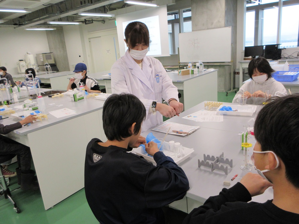 実験を担当するのは、理学部化学・生命科学科の鈴木光明准教授です。学生も2名、サポートしました。