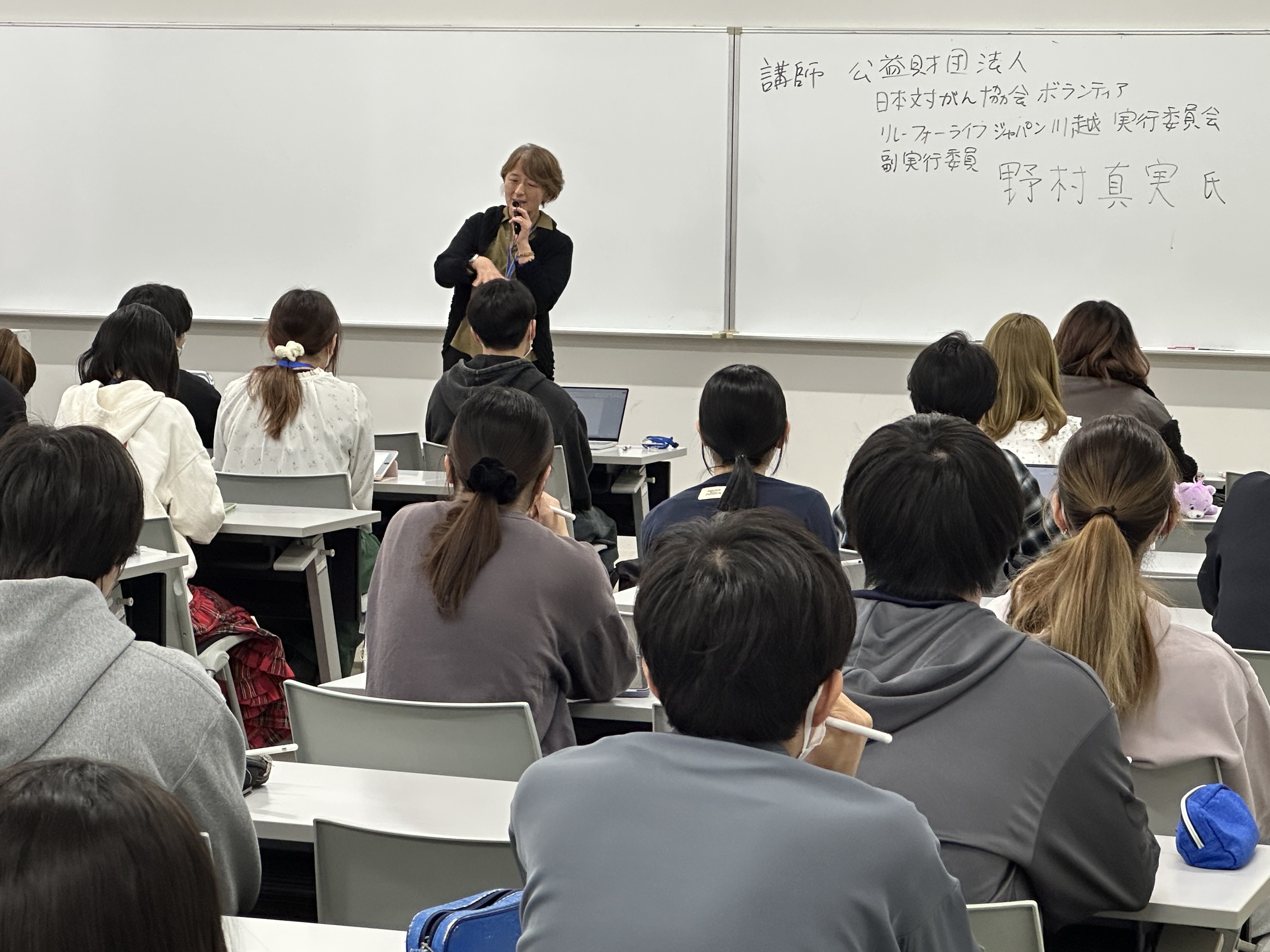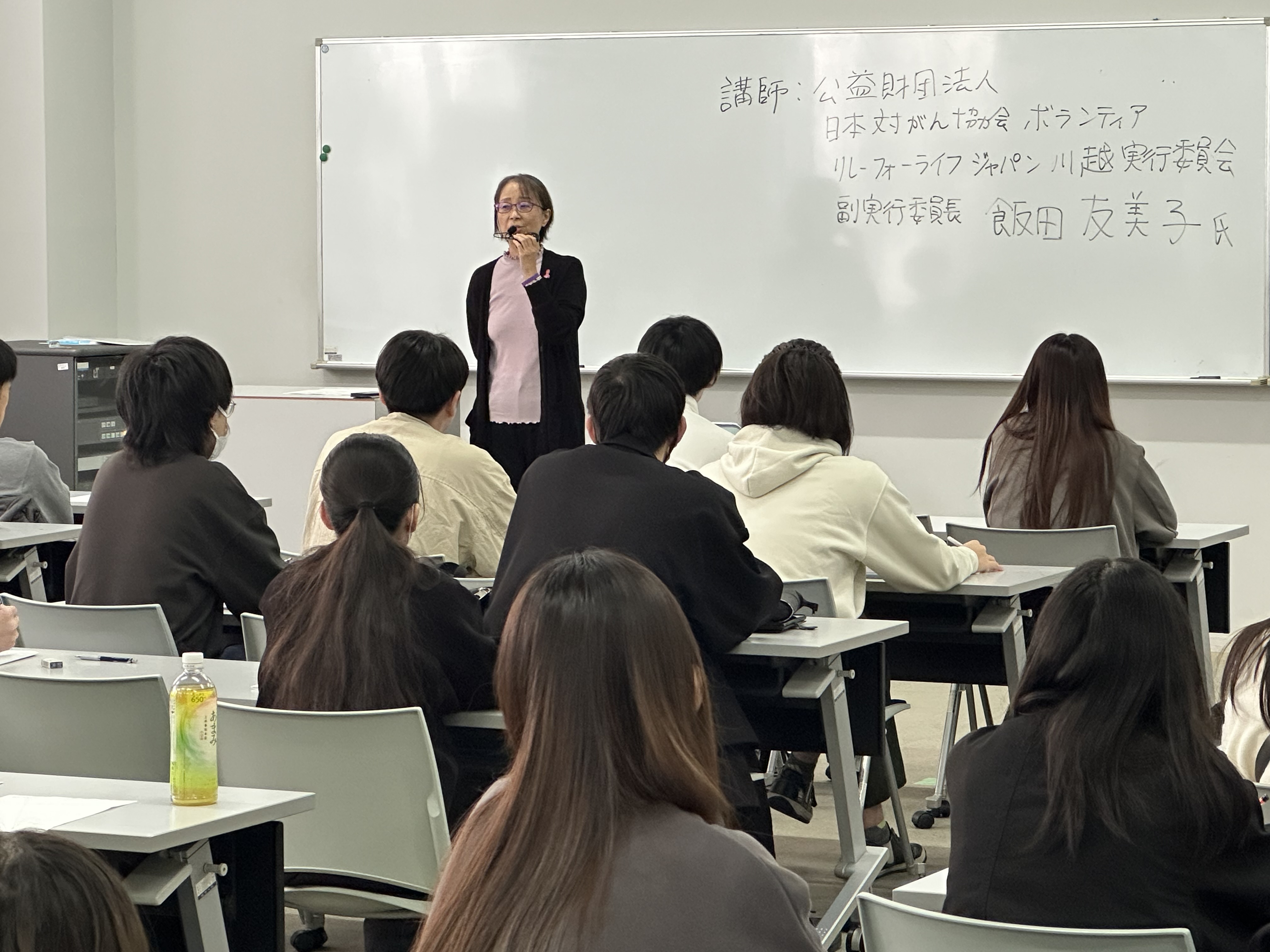 今回の座談会は、公益財団法人日本対がん協会リレー・フォー・ライフ・ジャパン川越から副実行委員長の飯田友美子氏と野村真実氏をボランティアとしてお招きして、がん闘病生活を乗り越えた今だから話せることなどをお聞かせいただきました。学生は、薬剤師になるため専門科目が中心になる勉学に勤しむ中で、教科書から学ぶことが難しい態度や振る舞いなどを患者様の声によって気付く機会をえました。
