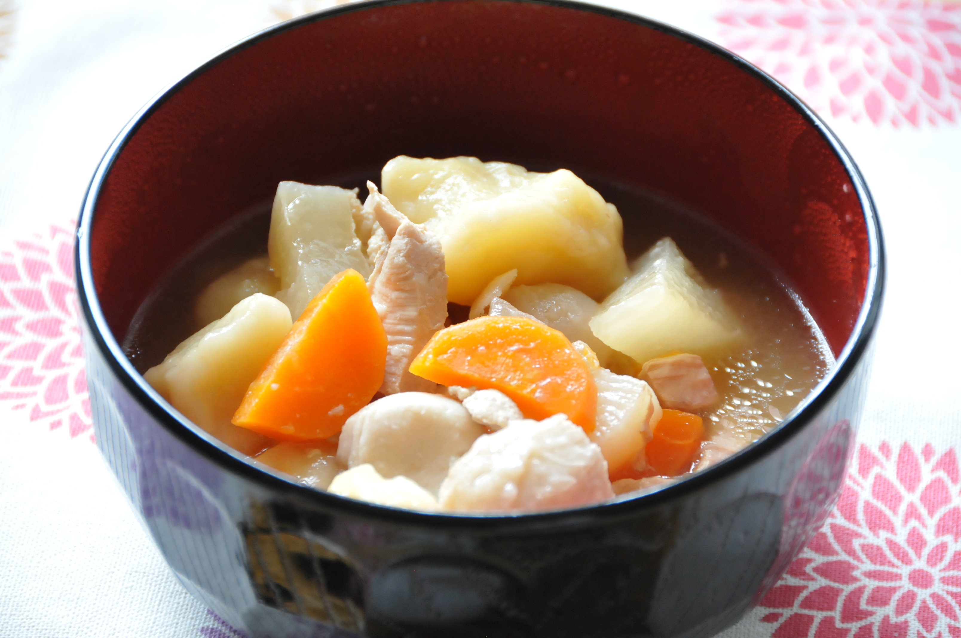 5. 鍋にだし汁を入れ、にんじん・大根・さといもを加えて、竹串が通る程度の柔らかさになるまで煮る。