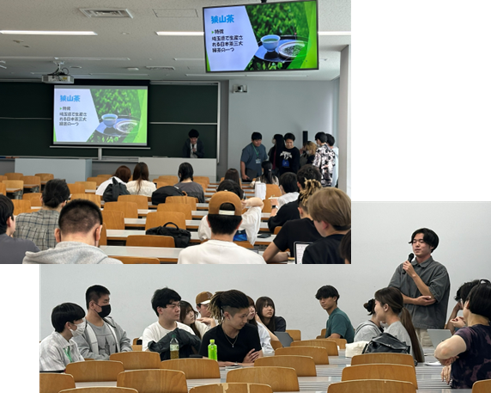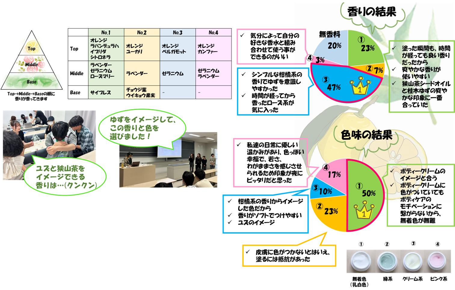 経営学部と総合政策学部の先輩たちの前で、緊張しながらもしっかりと、テクスチャー・香り・色味の検討決定についてプレゼンできました。