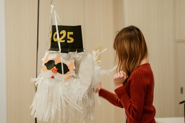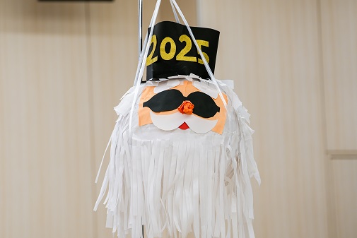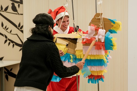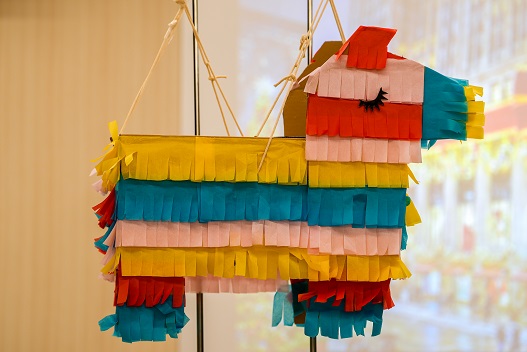 懇談のあと、JISTを代表したスリランカ出身の学生と留学生を代表した台湾からの交換留学生がピニャータ割りにチャレンジし、周りからの応援のおかげでピニャータを勢いよく割れる音が会場内に響き渡りました。