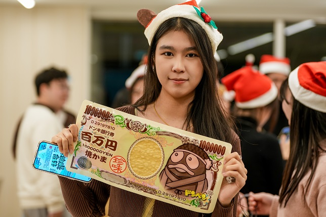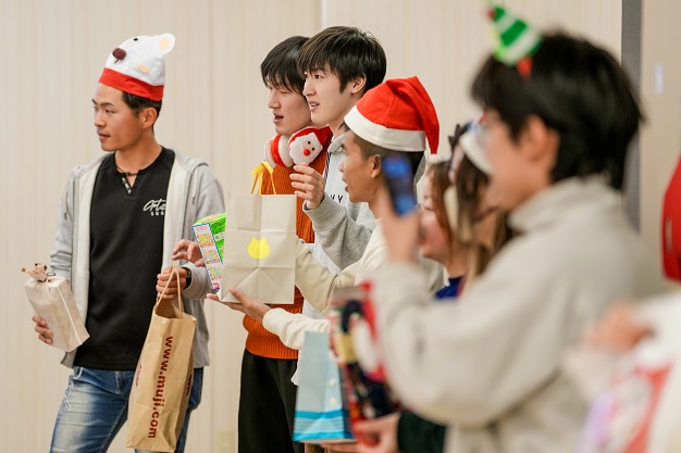 プレゼント交換の時間では、音楽に合わせて回ってくるプレゼントから自分のものになるのは何なのか、学生たちはワクワクしながら楽しんでいました。