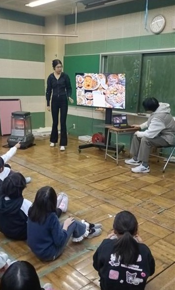 3年生のクラスに参加し、母国紹介を行いました。韓国の給食の写真や、教室で食べる日本の給食スタイルについて、互いに興味津々でした。質疑応答では、「『窓際のトットちゃん』が好きで、今日はトットちゃんの世界にいるようでうれしい」と話す留学生もおり、和やかな雰囲気でした。その後は班ごとに分かれ、小学生が優しい先生となり、折り紙(紙飛行機、サンタクロースなど)を教えてくれました。給食では、毛呂山町特産のゆずを使った料理をいただき、地域の紹介も受けました。