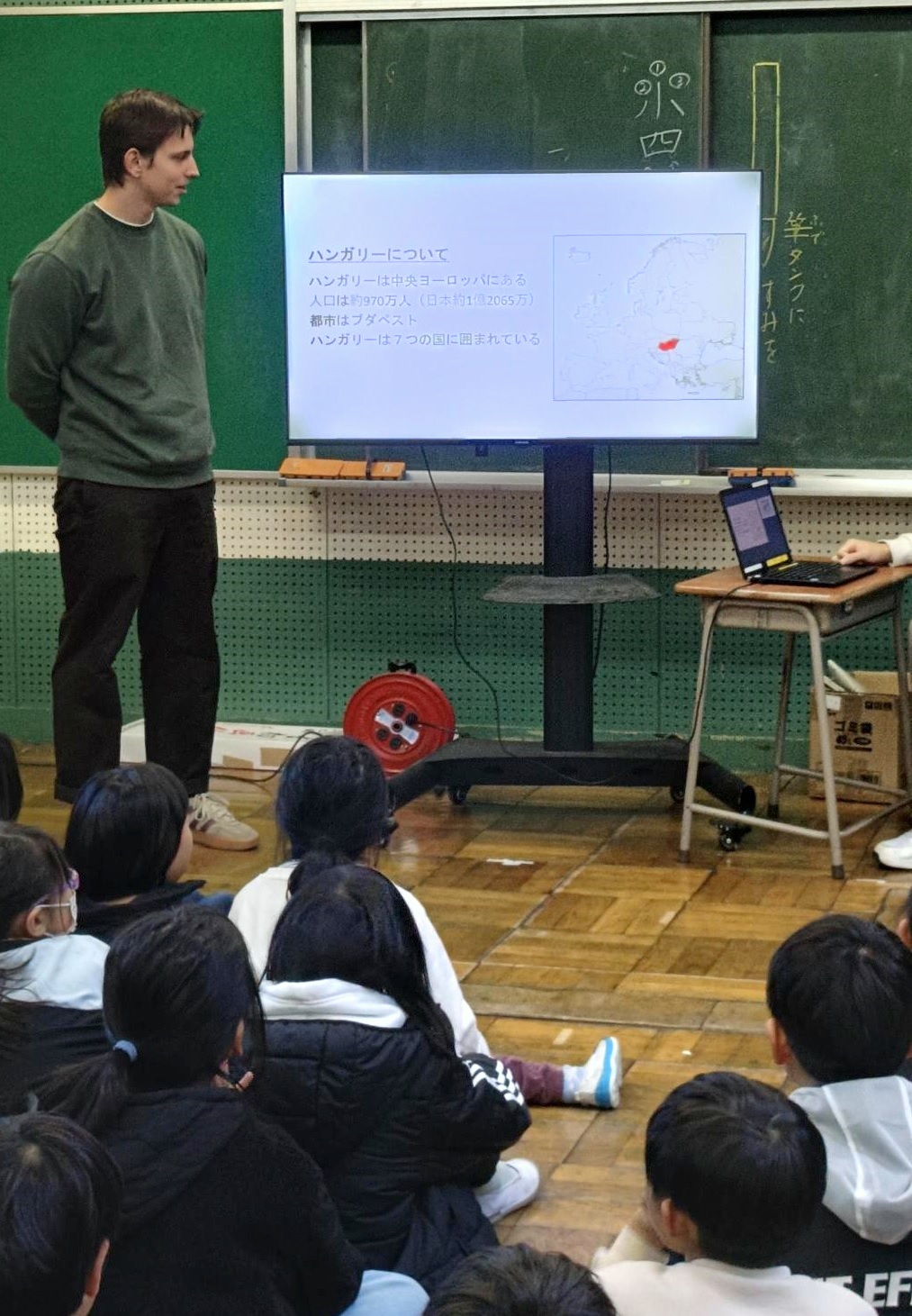 4年生のクラスに参加しました。小学生がハンガリー語、中国語、韓国語で挨拶をしてくれる温かい雰囲気の中、留学生の母国紹介がスタート。小学生からは多くの質問が飛び交いました。その後、体育館で韓国の遊びを一緒に体験。小学生からは南中ソーラン、合唱、リコーダー演奏が披露され、特に心を込めた合唱には留学生も大変感激していました。交流後には、名物の「ココア揚げパン」を給食でごちそうになり、楽しい時間を過ごしました。
