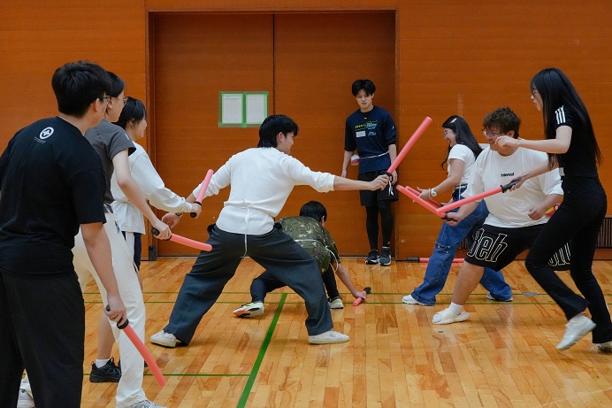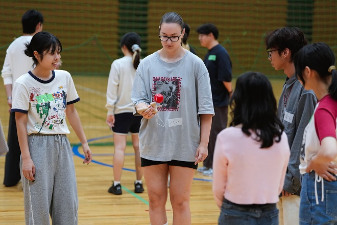 韓国、中国、ハンガリー、ポーランド、カナダ、日本と世界各国の学生36人の学生が一堂に会し、けん玉リレー、ストラックアウト、チャンバラ合戦、ドッジボールで汗を流しました。