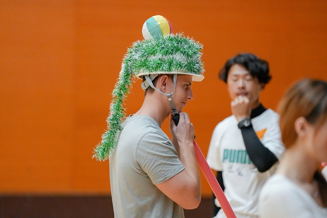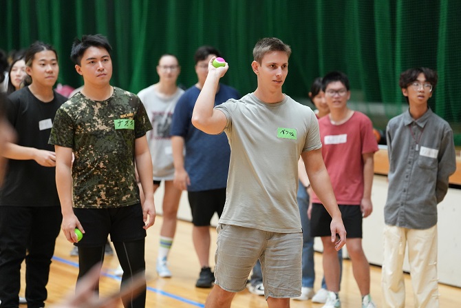 歓迎会には、9月に来日したハンガリー、中国、韓国、台湾の協定校からの交換留学生や共同教育プログラムの留学生を中心に、すでに入学しているタイ、中国、韓国、ミャンマーの留学生など、総勢約60名の留学生と在学生が参加し、けん玉リレー、ストラックアウト、チャンバラ合戦、ドッジボールで汗を流して親睦を深めました。