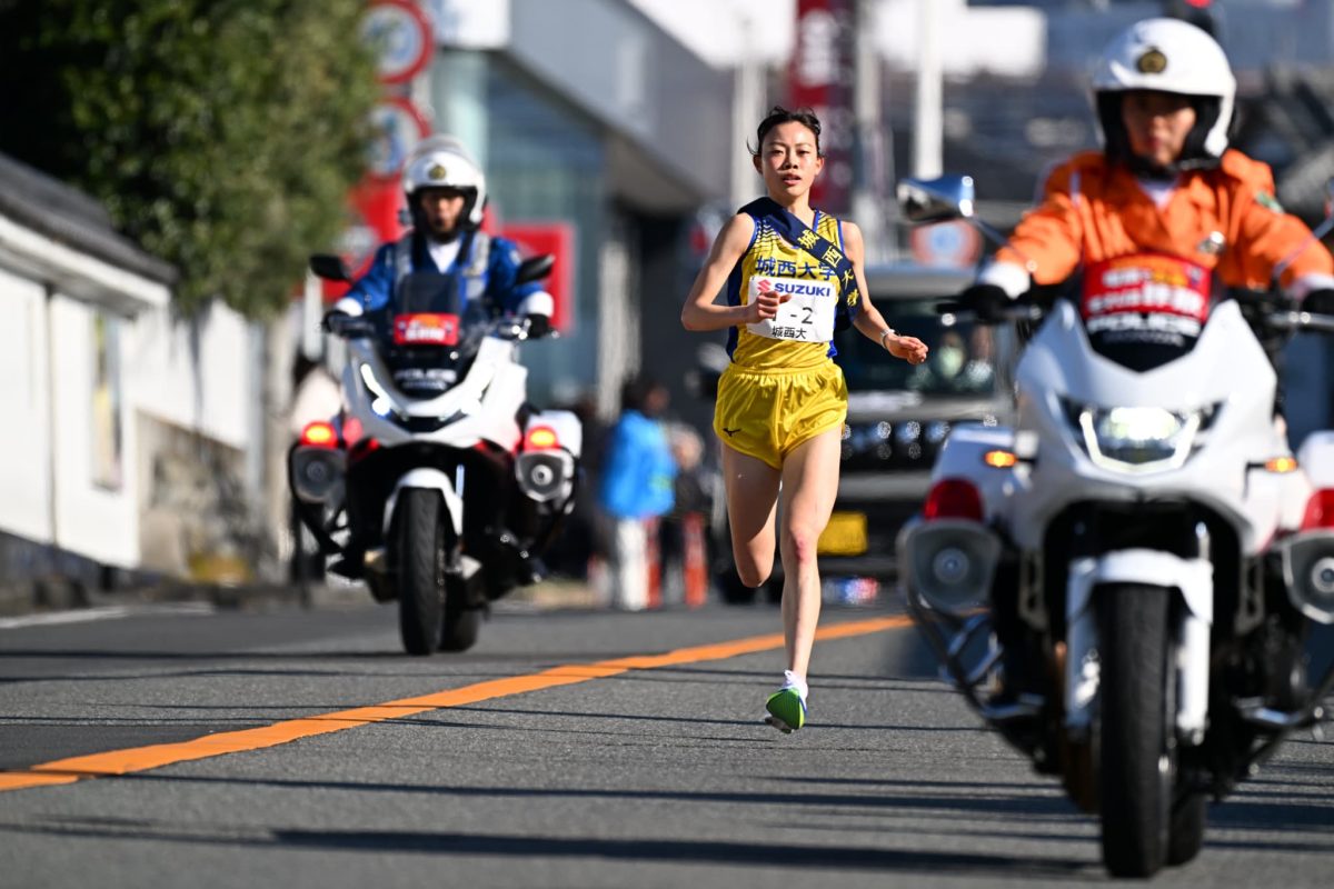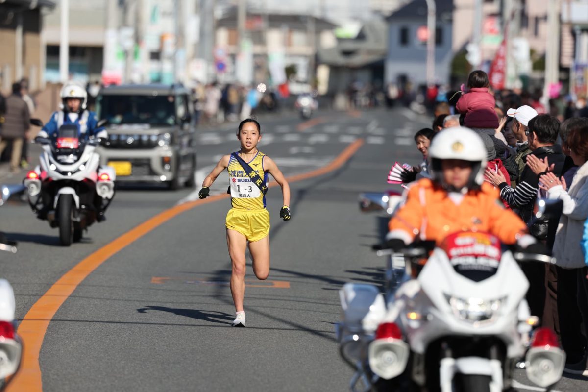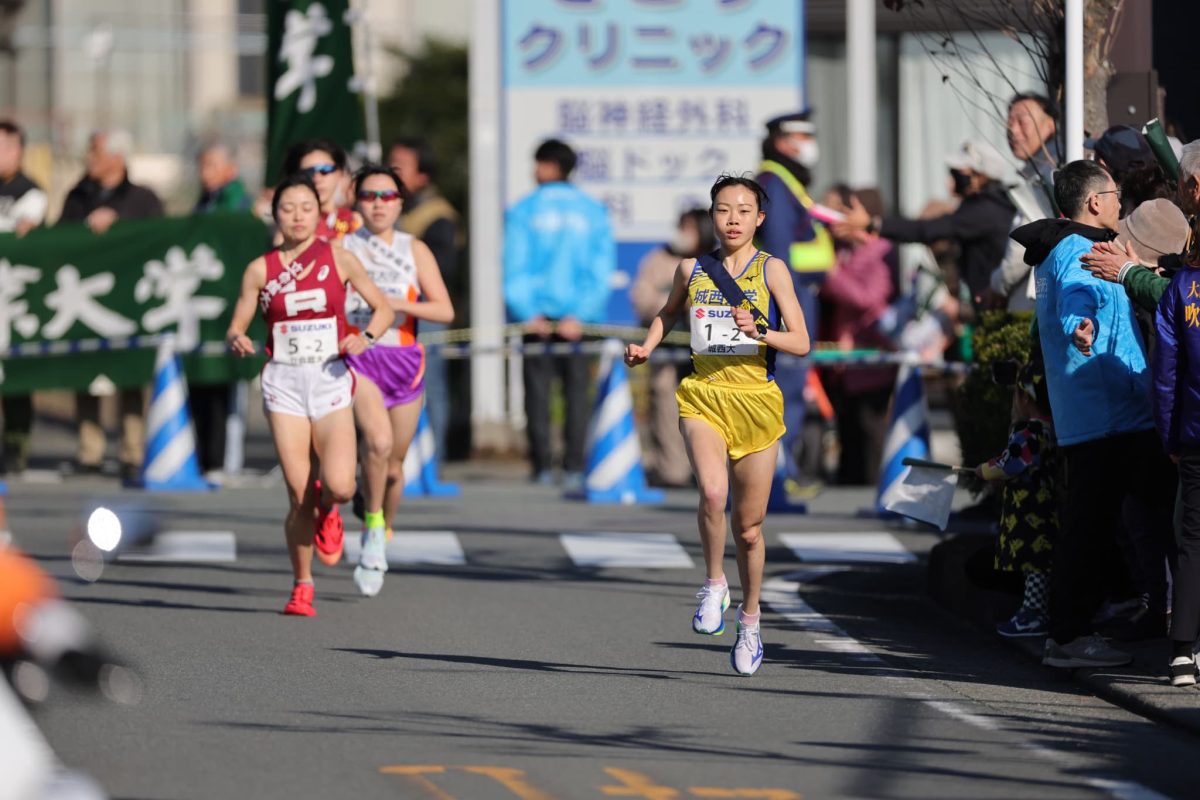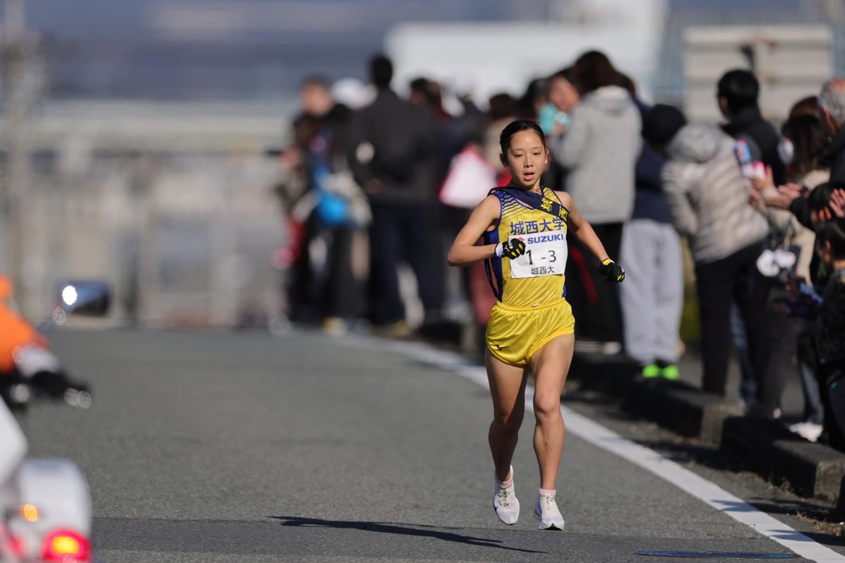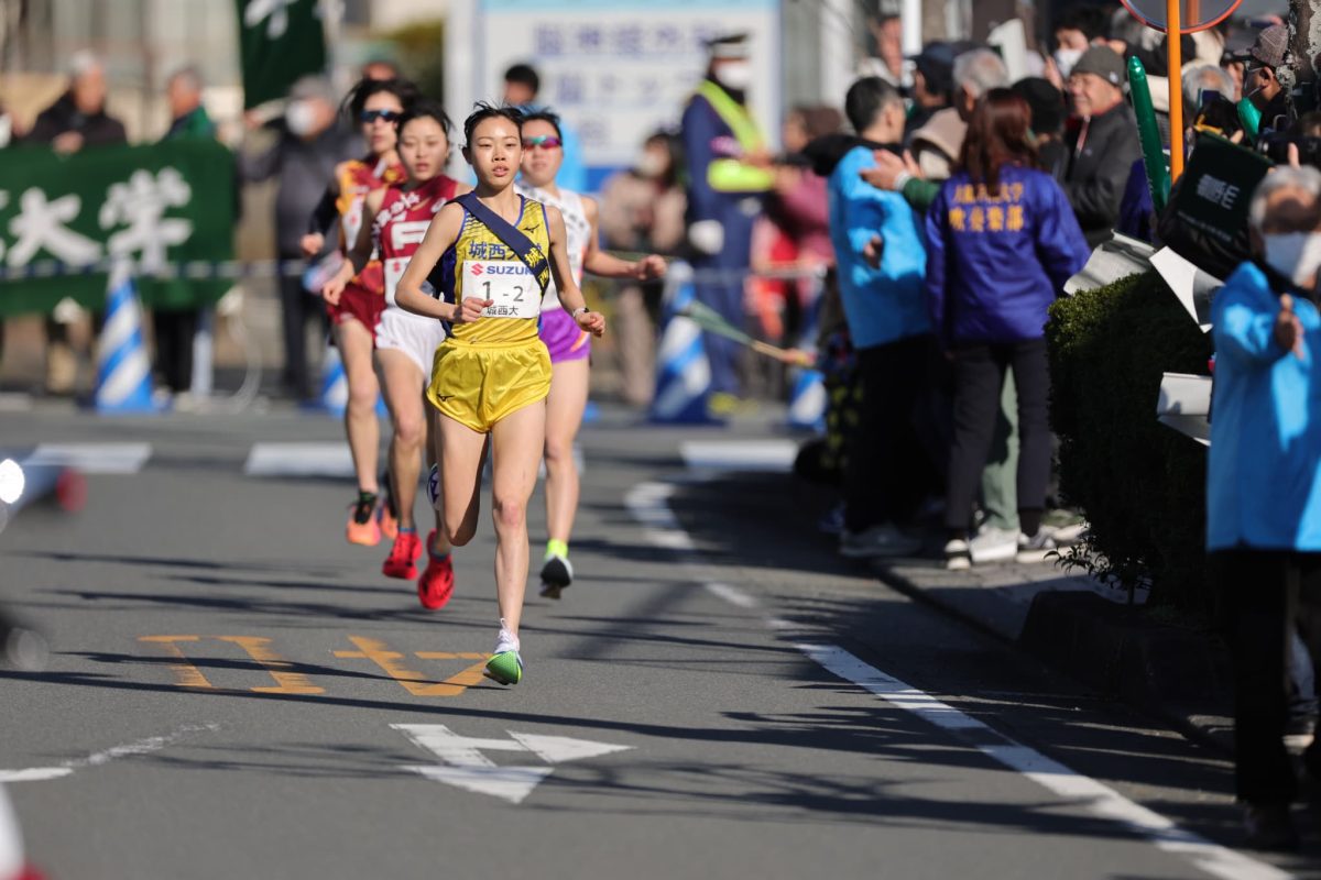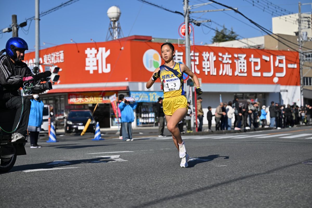 前半のエース区間・2区は、チームの主力となった本間 香選手(経営1)が務めました。全日本では1区で区間新・区間賞の快走で日本一に大きく貢献した本間選手は「全日本同様、自分のところで良い流れをつくり、優勝に貢献する走りができるよう105%の力を発揮します」と意気込んでいました。その言葉通り、区間新の圧巻の走りを見せ、2位と54秒の大差をつけました。