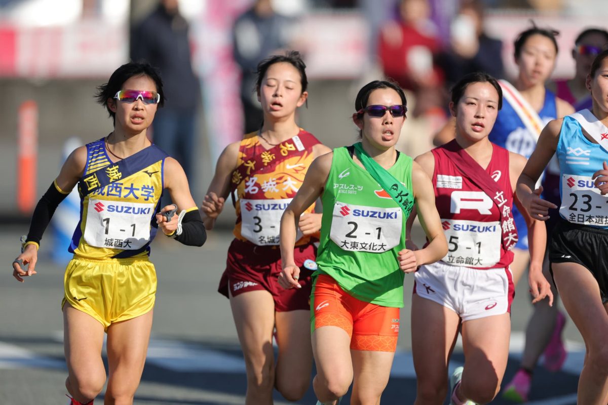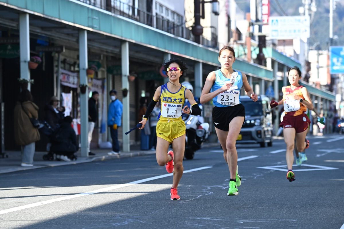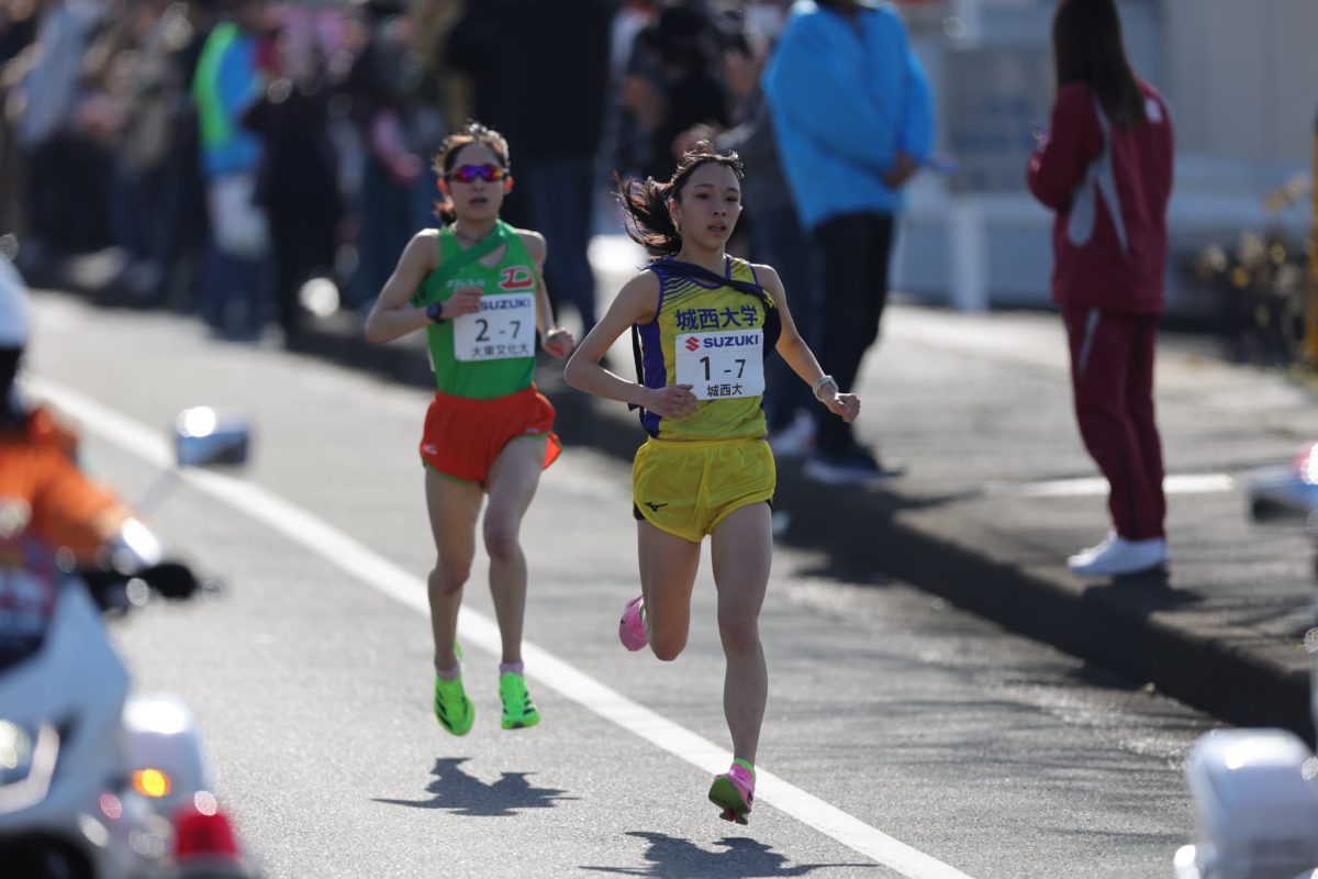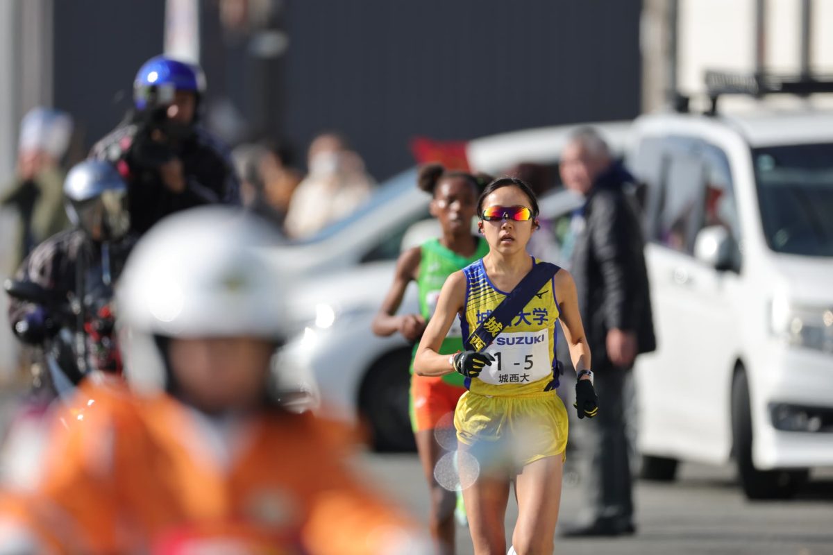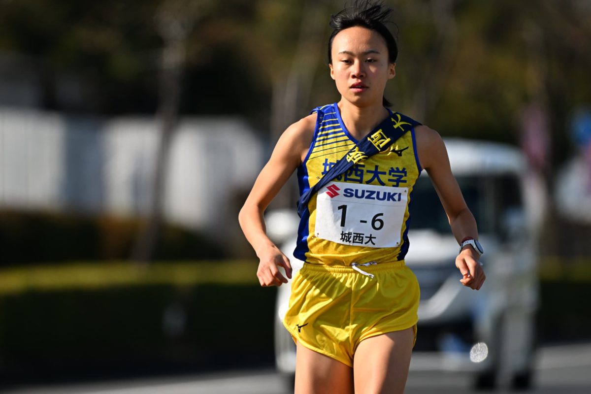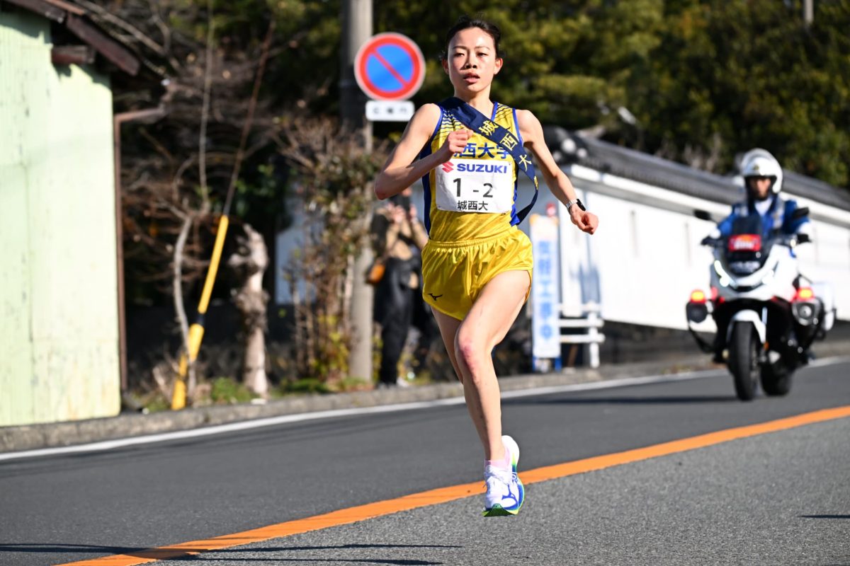 前半のエース区間・2区は、チームの主力となった本間 香選手(経営1)が務めました。全日本では1区で区間新・区間賞の快走で日本一に大きく貢献した本間選手は「全日本同様、自分のところで良い流れをつくり、優勝に貢献する走りができるよう105%の力を発揮します」と意気込んでいました。その言葉通り、区間新の圧巻の走りを見せ、2位と54秒の大差をつけました。