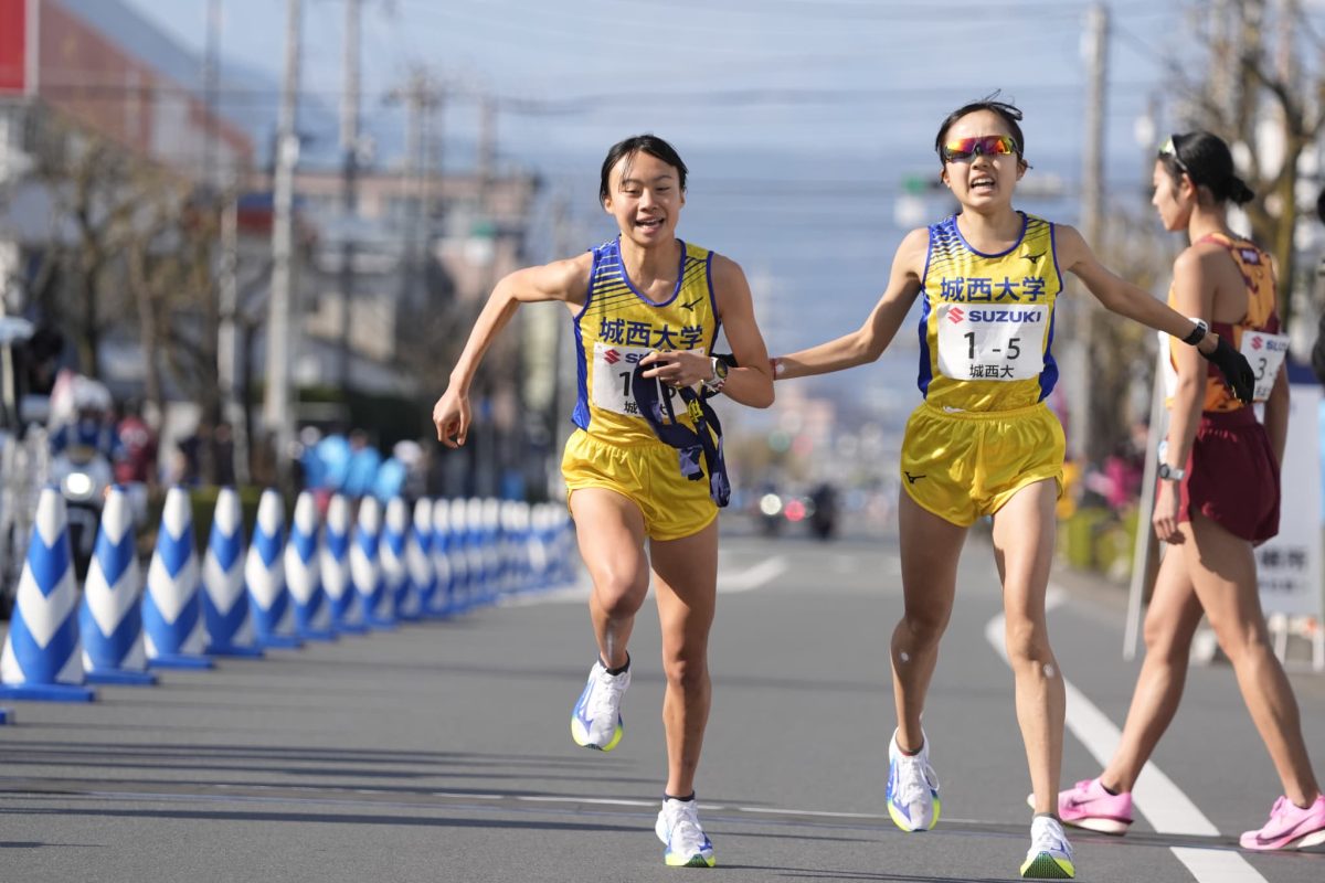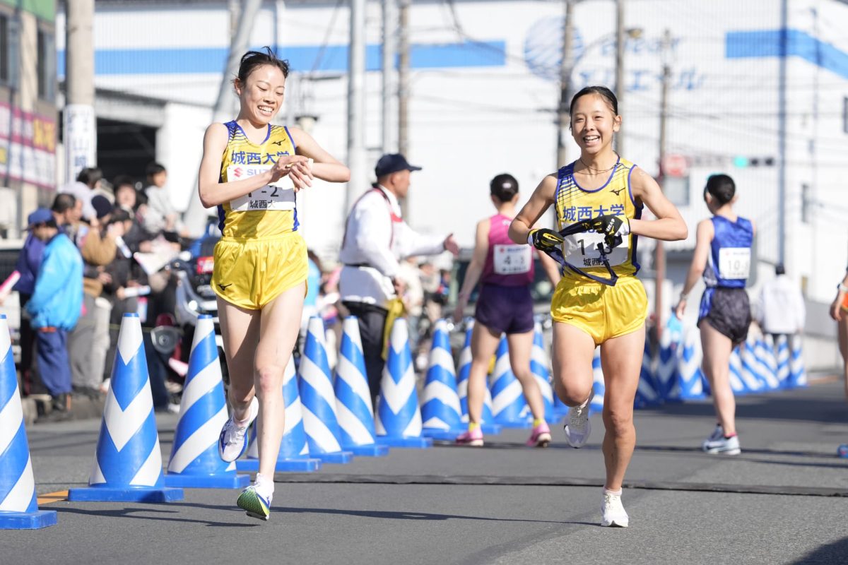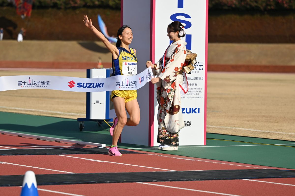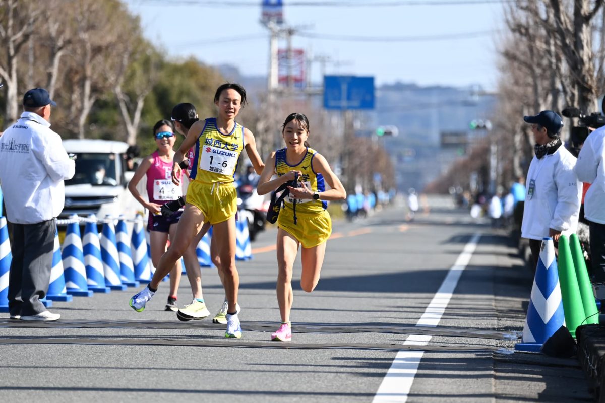 “魔の坂”を駆け上がる最終7区は、全日本3区で区間新だった同じくルーキーの大西 由菜選手(経営1)が担いました。「二冠を達成できるよう、自分が区間賞の走りをしてチームを勢いづけられるようにしたい」と決意を語っていた大西選手。大東文化大学の選手を抜いてトップに立ったものの、東北福祉大学の選手にかわされて2位に。しかし、区間賞を獲得した脅威の頑張りで抜き返し、右手を掲げながら笑顔でゴールテープを切りました。