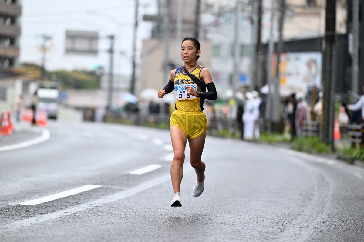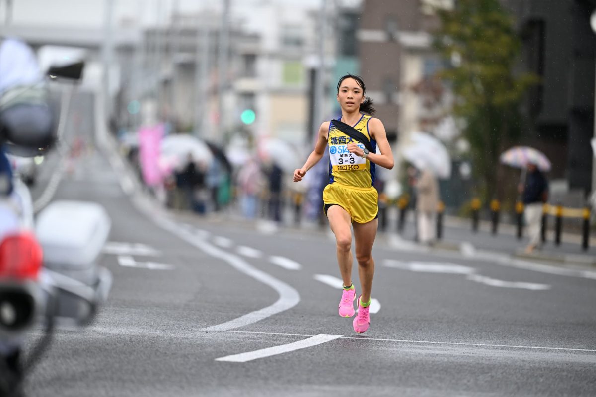 雨模様の中、先手必勝の1区は、赤羽周平監督が「最高戦力」と評価するルーキーの本間 香選手(経営1)が担いました。入学後、自己新を連発して10月4日の関東女子駅伝の5区でも区間新。「全日本でも区間賞を獲得し、1秒でも早く襷を渡してチームの優勝に貢献する走りがしたい」と抱負を語っていた本間選手。その言葉通り、スタート直後から先頭でレースを展開し区間記録を18秒も更新する激走を見せて起用に応えました。