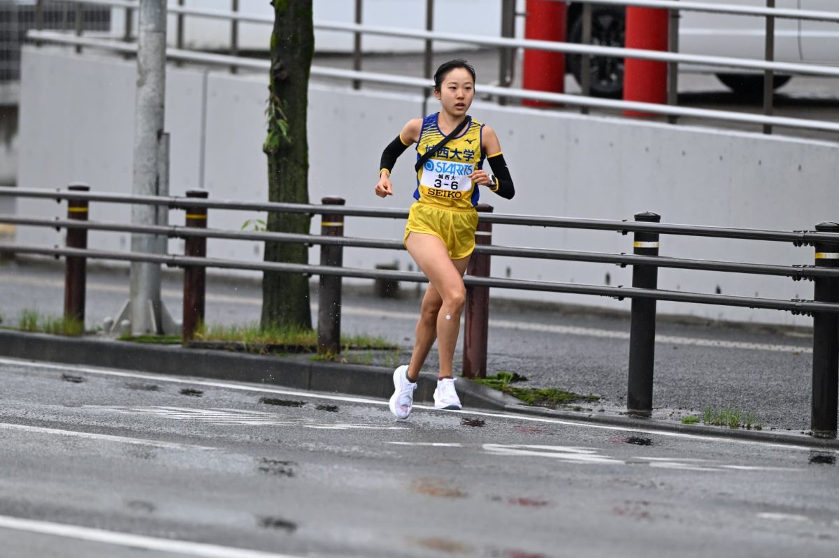 3区もルーキーの大西 由菜選手(経営1)が抜擢されました。関東女子駅伝では4区で区間新だったものの、2秒差で区間賞を逸した大西選手。「関東大会のリベンジをして優勝に貢献できるよう頑張りたい」と決意を語っていました。この日も区間賞は獲得できなかったものの、3区間連続の区間新の走りでさらに2位を引き離しました。