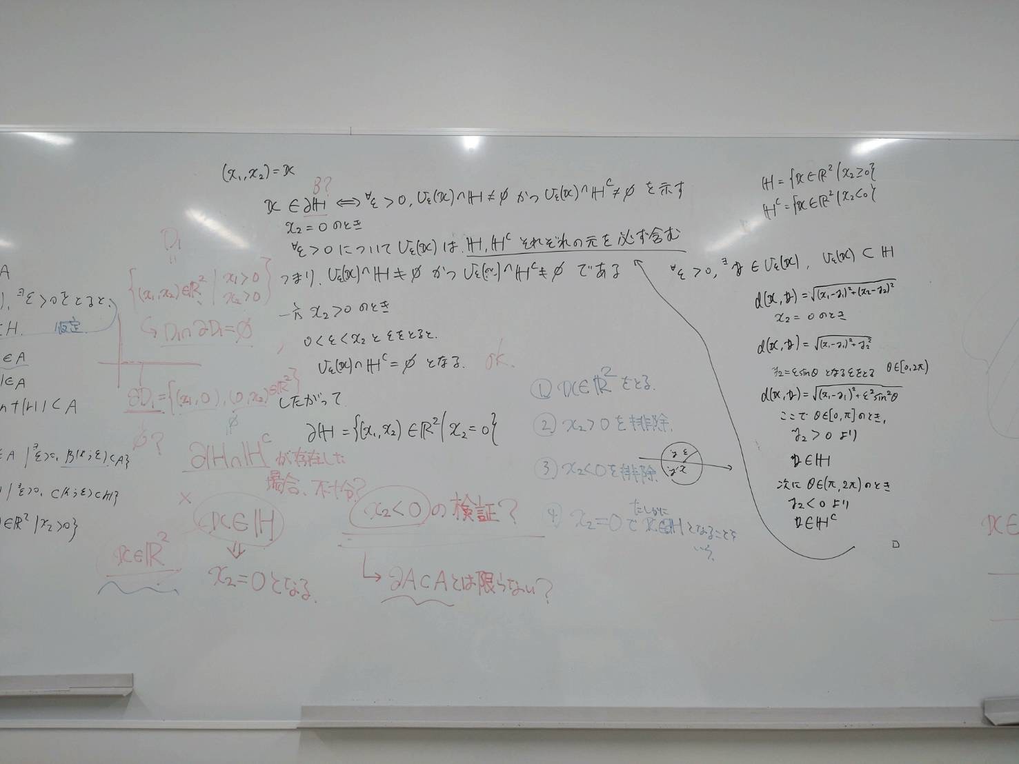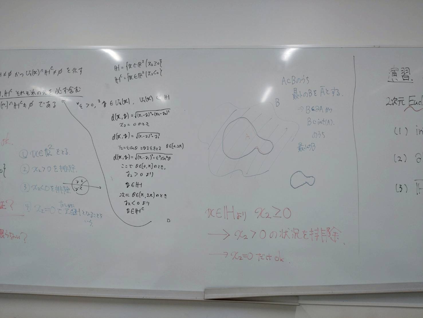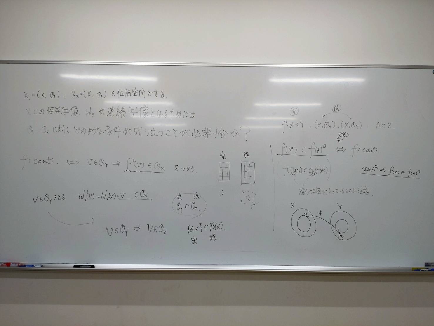 今年は、金曜3、4限目に勉強会を行っていました。テーマを位相空間論について、授業で扱われなかった内容の補完やより発展的な話題に親しむことを目的としています。