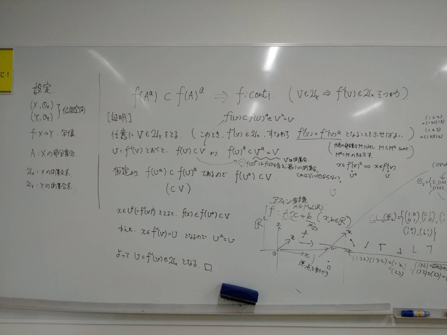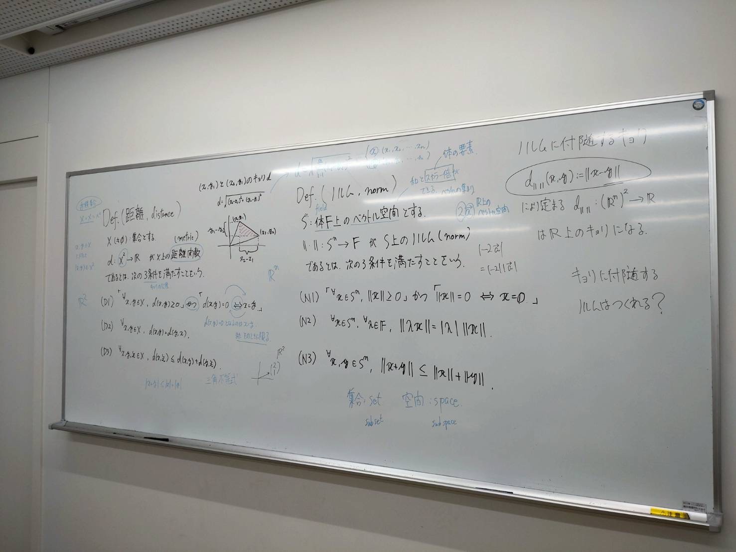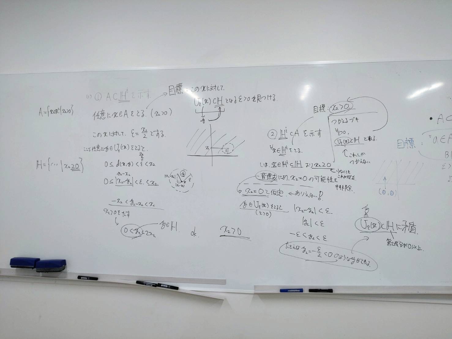 今年は、金曜3、4限目に勉強会を行っていました。テーマを位相空間論について、授業で扱われなかった内容の補完やより発展的な話題に親しむことを目的としています。
